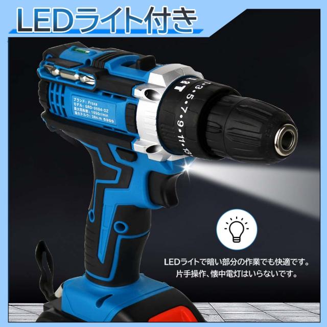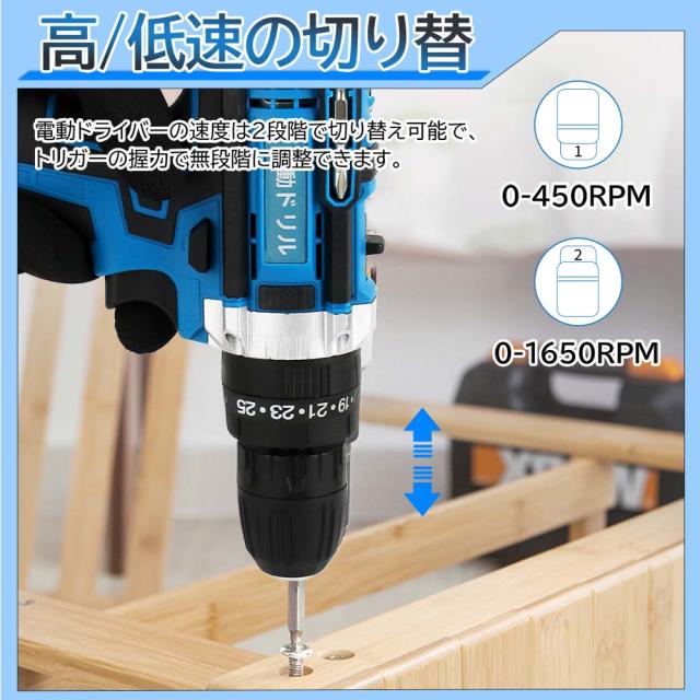 25+2段階トルク調整機能によって、素材に合わせて自由にトルクを調整可能です。最大トルクは28N.mに達し、 電動ドリルの回転スピードは2段階(0~450RPM/0~1650RPM)が切り替え、その以上トリガーを握る力の強弱で無段変速が可能で、スピード調節とトルク調節機能で幅広い材質に傷をつけず、きれいな組み立てができます。