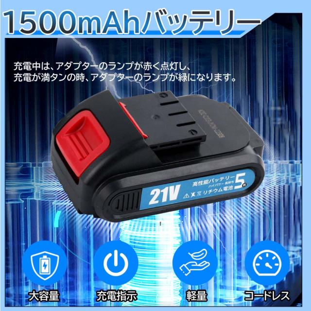 1.5Ah大容量電池搭載し、長時間連続作業可能です。