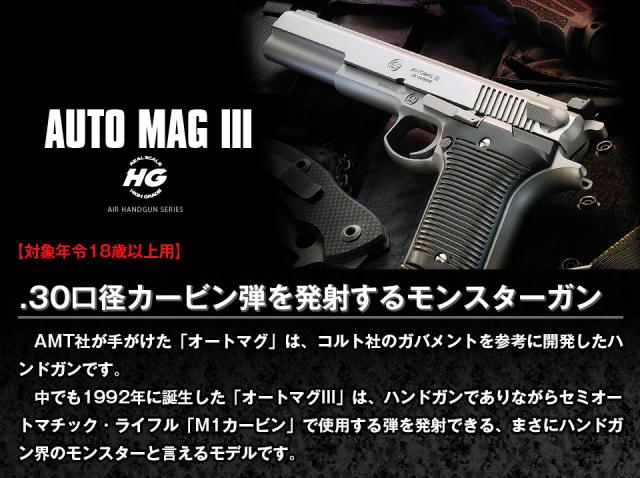 オートマグIII本体、マガジン(装弾数25発)、保護キャップ、取扱い説明書、BB弾(0.12g/100発)、他