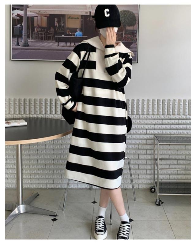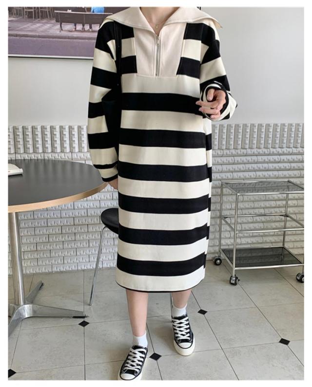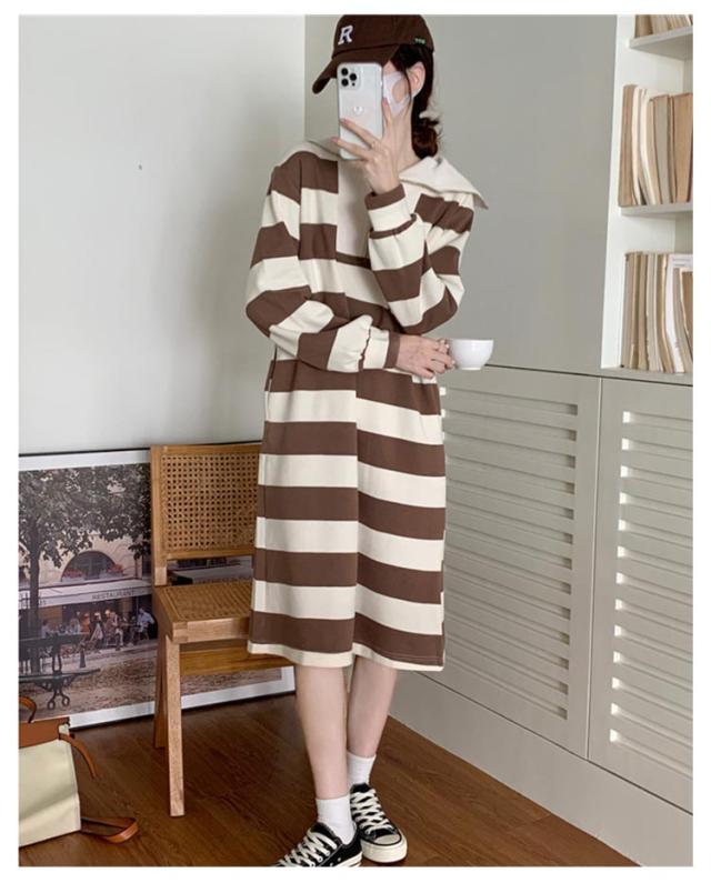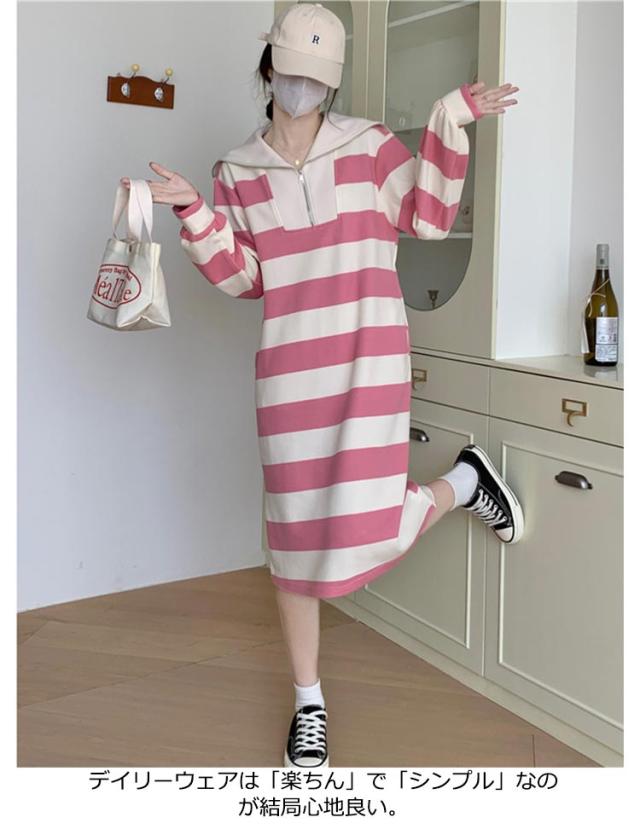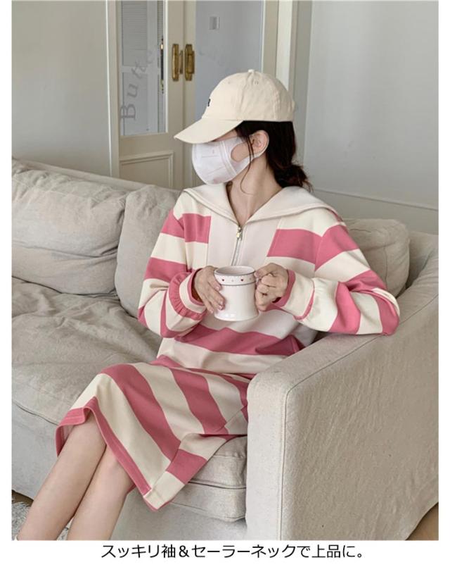 インナー 長袖 ロング丈 ふんわり ワンピ 綿混 長袖 ミモレ丈 膝下 セーラー ポッケト レディース セーラーネック 裏毛 無地 ボーダー ストライプ ゆったり 秋 冬 ルームウェア ワンピース