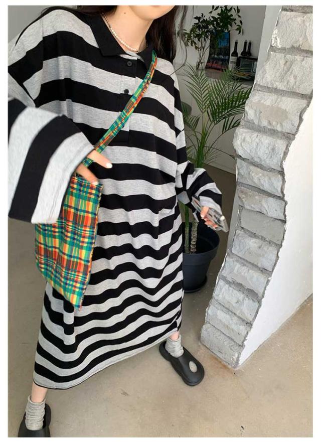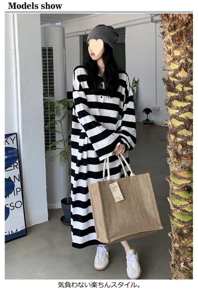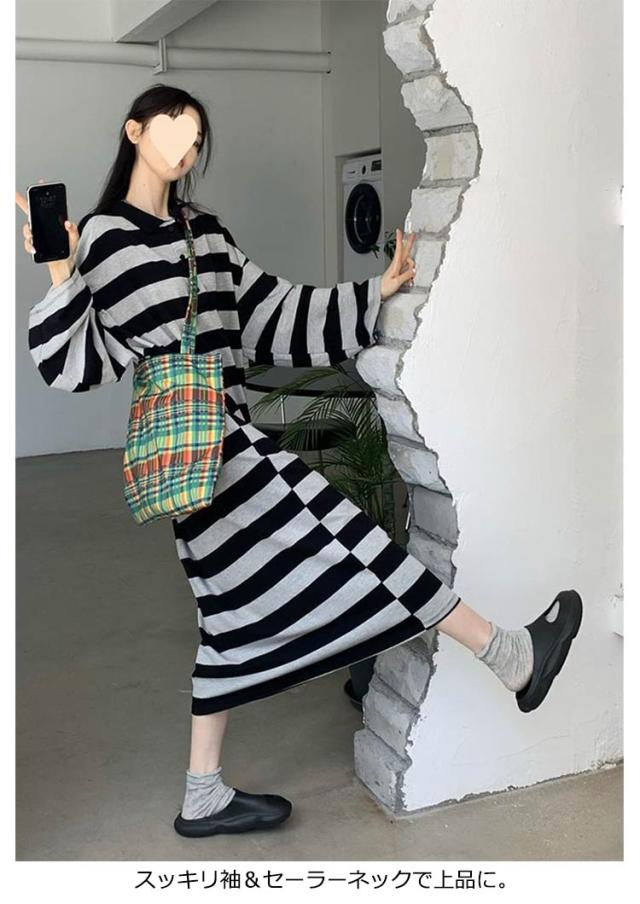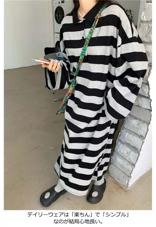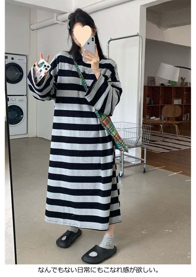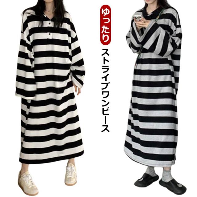 ストライプ ロング丈 膝下 レディース 長袖 ミモレ丈 長袖 ふんわり ポッケト POLO poloネック ワンピ 綿混 裏毛 無地 ボーダー 秋 ゆったり ワンピース 冬 インナー ワンピース