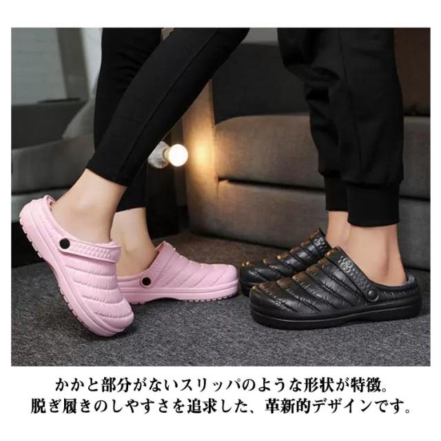| 暖かな冬用裏ボアサンダル かかと部分がないスリッパのような形状が特徴。脱ぎ履きのしやすさを追求した、革新的デザインです。 アッパーには撥水加工が施されているので水を弾いて濡れにくく、ちょっとした外出やベランダ履きにもピッタリです。 中綿仕様なので寒い日でも足元が冷えにくく、室内履きとしても大活躍します。 グリップ力抜群の防滑ソールなので、滑りにくく歩きやすくなっています。 足裏には滑り止め加工が施されているので、フローリングの上でも安心! 冬厚手のソックスを履くことを考えると、1-2サイズ大きいのを選択してことがいいです。 ふわふわの履き心地で、お部屋でのリラックスタイムをさらに豊かにしてくれます。 ご自身用にはもちろん、ギフトにもおすすめの一足♪ | |