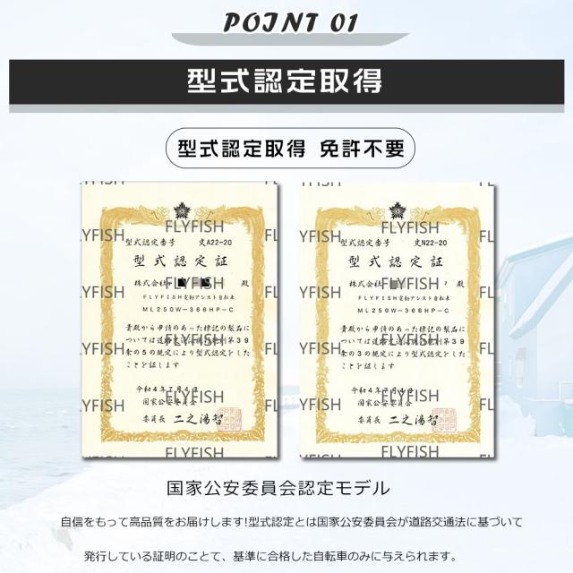 - FLYFISHは安心の【型式認定】取得済みのデザインと機能性を兼ね備えた折りたたみ電動アシスト自転車 型式認定とは、国家公安委員会が道路交通法に基づいて発行している証明のことで、基準に合格した自転車のみに与えられます。