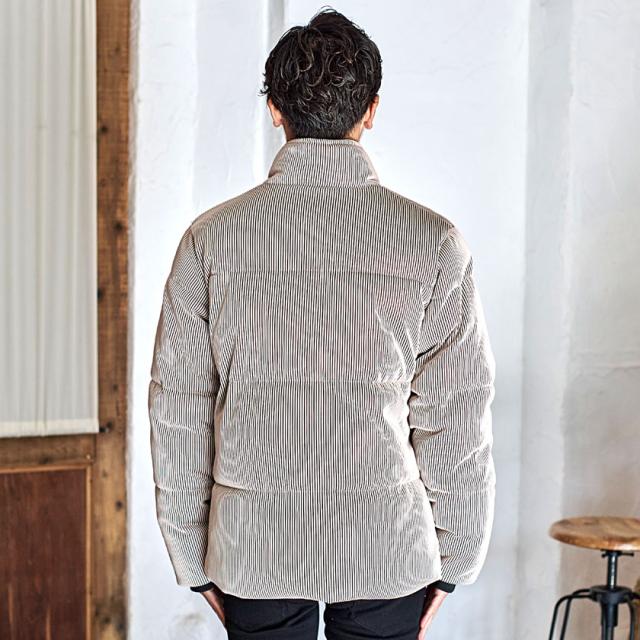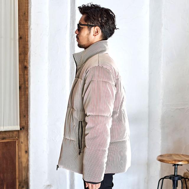 ストライプの凹凸が特徴的で、動くたびに表情がキレイに出るアウターです。