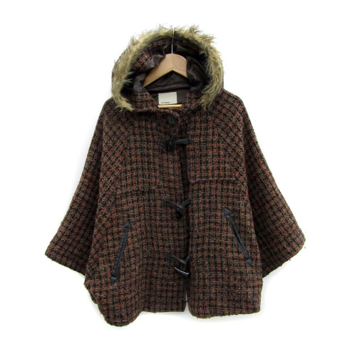 【中古】オリーブデオリーブ ダッフルコート ポンチョ風コート ミドル丈 ツイード ファー ブラック 黒 レディース