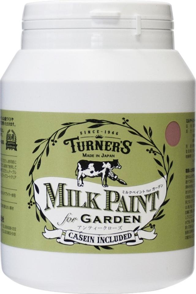 ◆商品名:ターナー色彩 アクリル絵具 ミルクペイント for ガーデン アンティークローズ MKG45337 450ml<br>DIYを安全に気軽に楽しむために原料にこだわった屋外向け本格はオリジナルペイントです。屋内向けのミルクペイントより対候性が優れており、森永乳業のミルク原料を使用した天然由来の水性ペイントなので環境にもやさしく安心してお使いいただけます。アンティークな落ち着いた色調でありつつ、お庭やベランダの草花に映えるような14色を取り揃えております。ガーデニングで使う植木鉢や柵、ラティス、木製ベンチなどのペイントリメイク