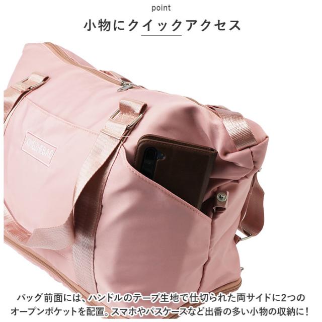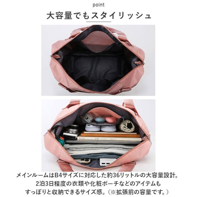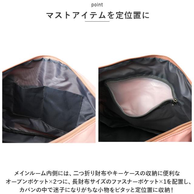 | 商品説明 | ・荷物が増えたら、容量がぐーんと拡張!トラベルだけでなく、タウンユースでもお洒落に持てる「2WAYボストンバッグ」が新登場。 【トラベルシーンを華やかに演出】 ・艶やかなくすみカラーのボディに、光沢感のある同系色のテープ生地を合わせたファンシーなルックスが旅行のお供に最適。(※一部ベーシックカラーの商品もございます。) 【大容量でもスタイリッシュ】 ・メインルームはB4サイズに対応した約36リットルの大容量設計。2泊3日程度の衣類や化粧ポーチなどのアイテムもすっぽりと収納できるサイズ感。(※拡張前の容量です。) 【パッキング作業がスムーズ】 ・開口部は左右に大きく開くダブルファスナーを採用。バッグの中がひと目で見渡せて、旅行前のトラベルグッズのパッキングがスムーズ。 【荷物が増えても安心】 ・バッグ底面は360度ファスナーを開放することで容量がぐーんと拡張。旅行先や外出先で荷物が増えてもラクラク収納可能。 【マストアイテムを定位置に】 ・メインルーム内側には、二つ折り財布やキーケースの収納に便利なオープンポケット×2つに、長財布サイズのファスナーポケット×1を配置し、カバンの中で迷子になりがちな小物をピタッと定位置に収納! 【ジムに最適・はっ水ポケット】 ・長財布サイズのポケットは、運動後のスポーツウェアやタオル、濡れた水着などを分けて持ち帰ることのできるはっ水機能付き。(※完全防水仕様ではありません。水分を多く含んだ物を収納すると、ファスナー開口部から水が染みだすことがあります。) 【小物にクイックアクセス】 ・バッグ前面には、ハンドルのテープ生地で仕切られた両サイドに2つのオープンポケットを配置。スマホやパスケースなど出番の多い小物の収納にオススメ! 【スタイリング自在の2WAY仕様】 ・手提げスタイルはもちろん、荷物が多くなった時には、バッグ背面側ハンドルをスナップボタンで長さ調節し、リュックのように背負うこともできるユニークな2WAY仕様。 |