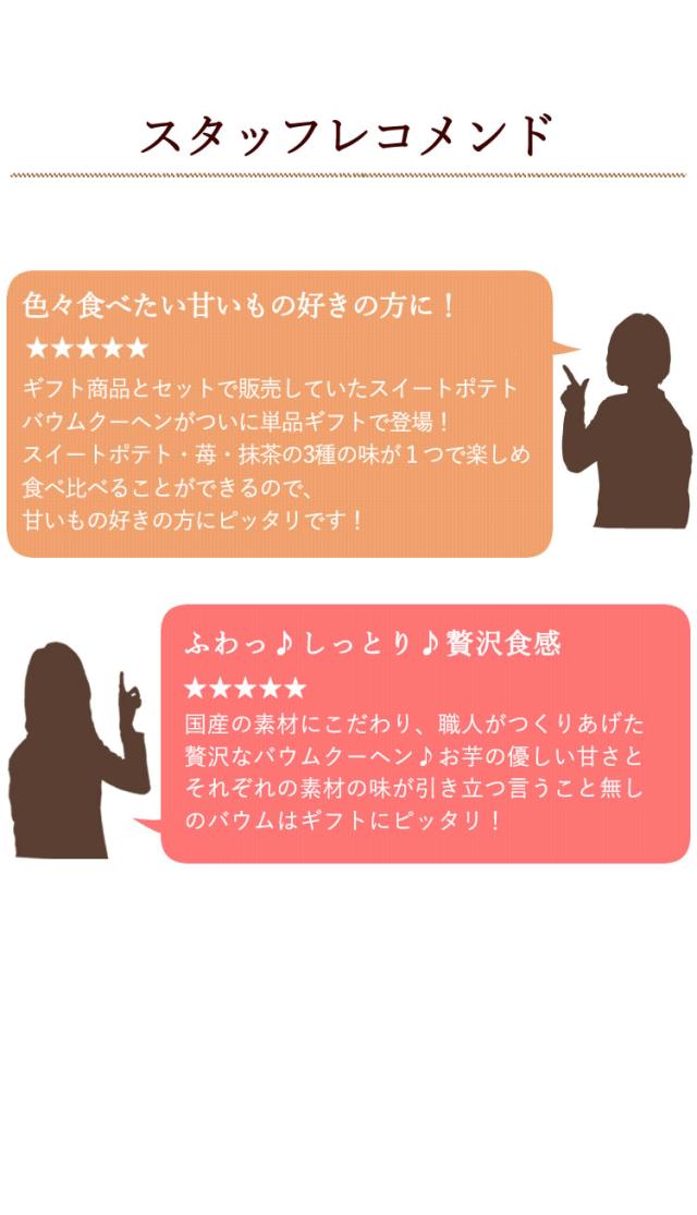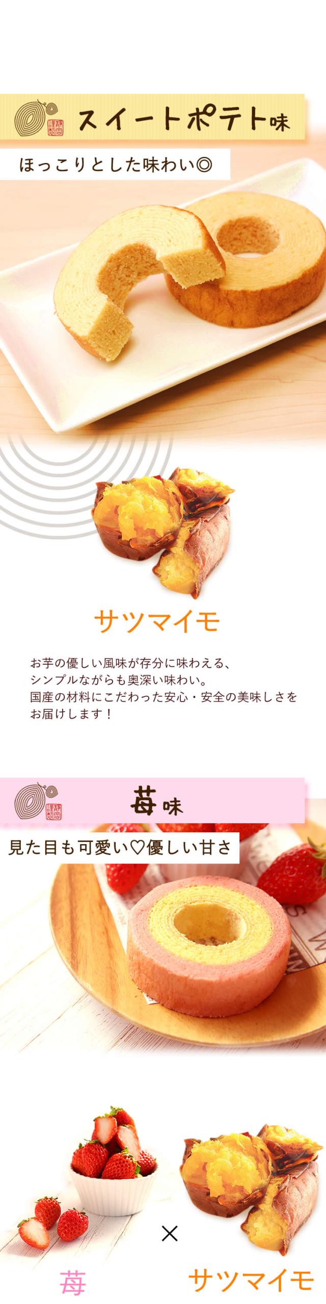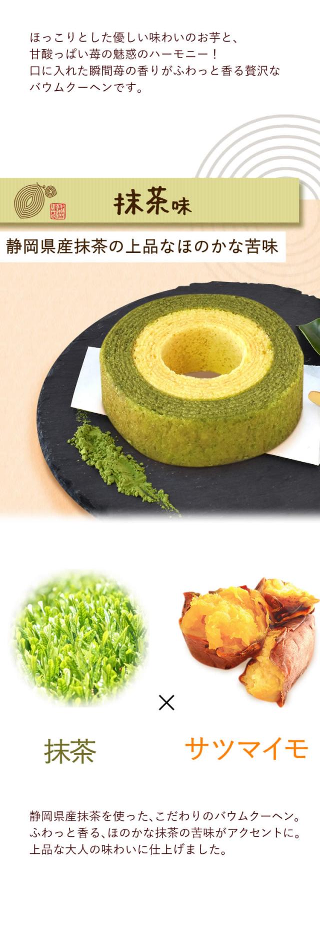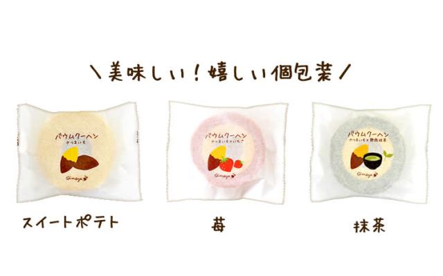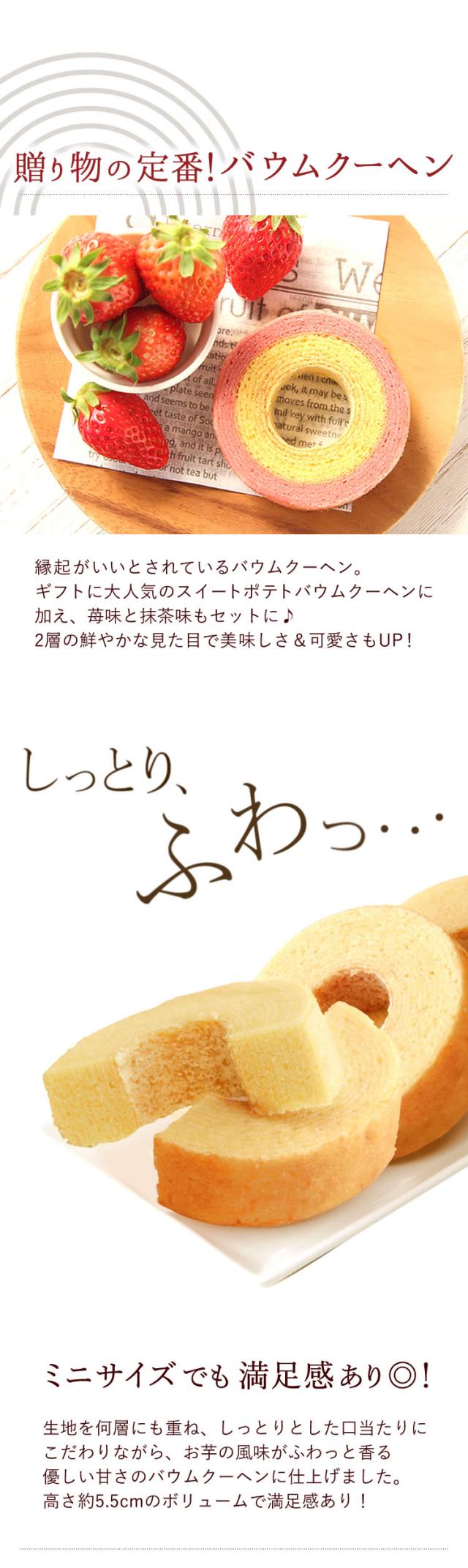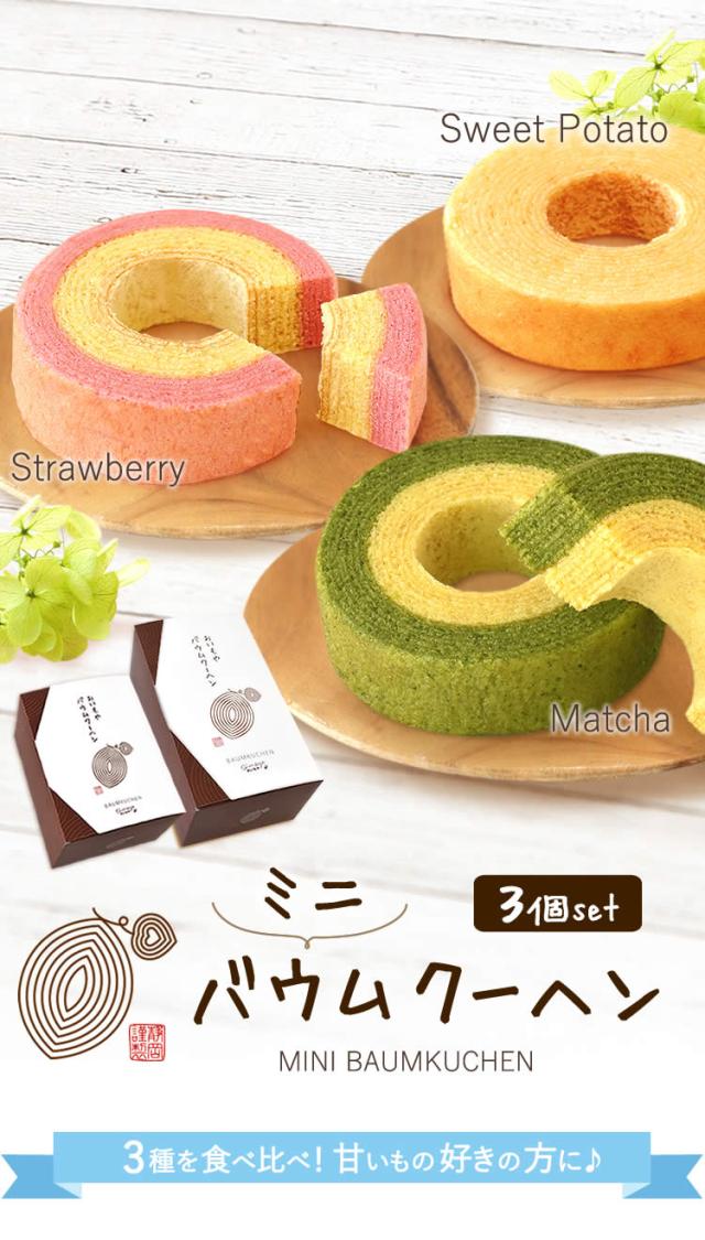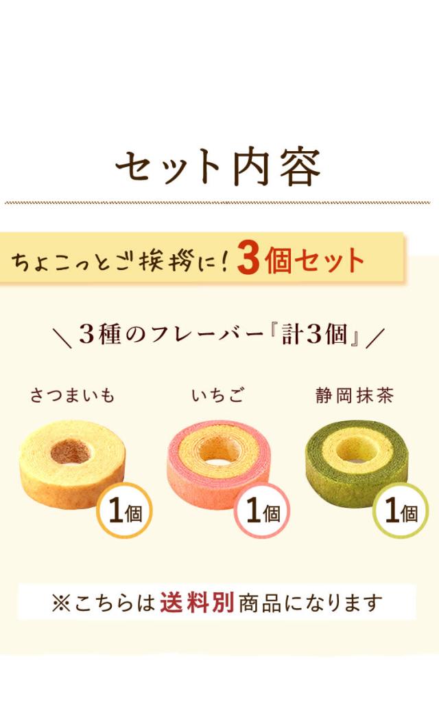 【3個セット】 ○スイートポテトバウムクーヘン……1個 ○苺バウムクーヘン……1個 ○抹茶バウムクーヘン……1個 |