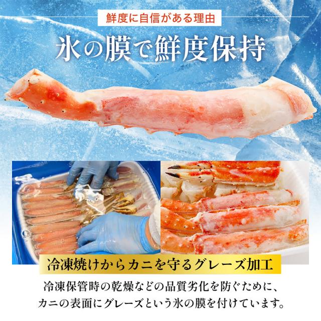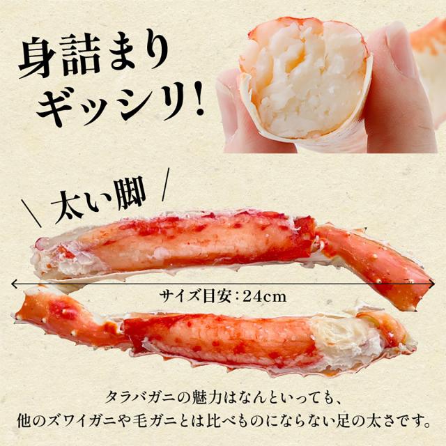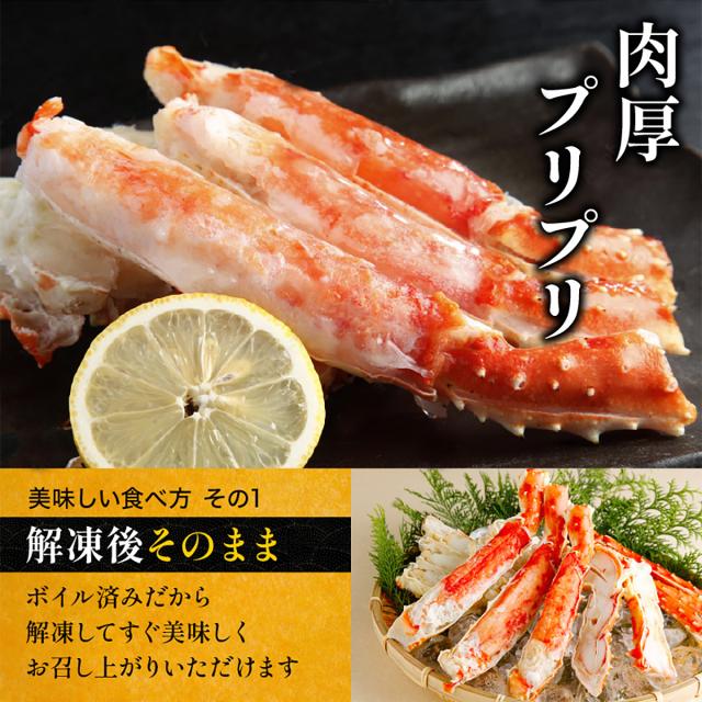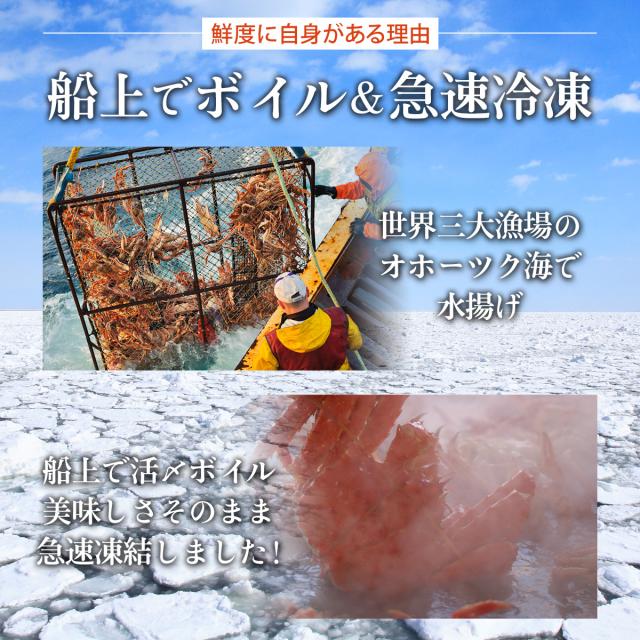 タラバガニの魅力はなんといっても、他のズワイガニや毛ガニとは比べものにならない足の太さです。世界三大漁場のオホーツク海で水揚げ直後に船上で活〆ボイルし、美味しさそのまま急速凍結した一級品です。自然解凍するだけで、まるで未冷凍のような身質と食感、そして身離れの良さを実現しました。とても冷凍品とは思えない、活茹での味と殆ど変らない抜群の味にビックリすること間違いなし!大きさといい、味といいタラバガニの魅力を存分に楽しめる逸品です。