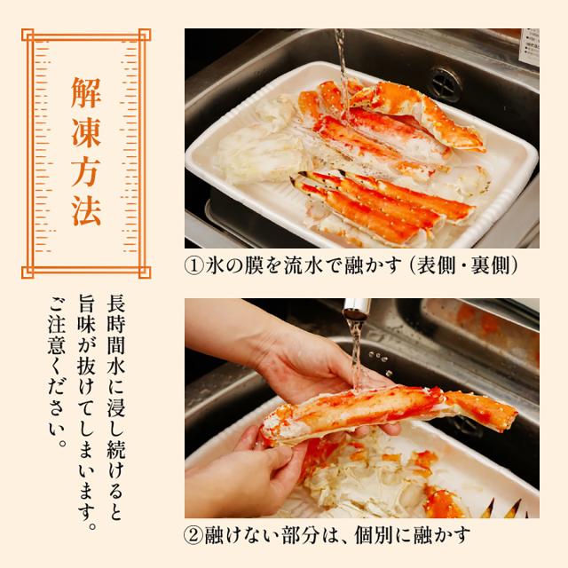 お急ぎの場合は、グレーズを落としたカニをジップ付きの袋に入れて流水で7〜8割ほど解凍してください。完全に解凍させないのが、旨味を逃がさないコツです。