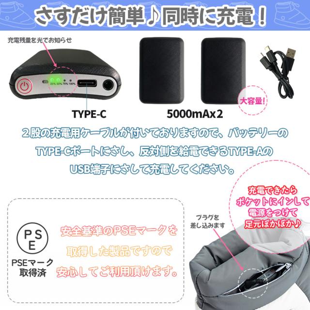 5000mAhのバッテリーが2個付いているので、いつでもUSB充電ケーブルに接続して充電できて便利です。つま先から足の甲、足裏まで温めます。2股のケーブルが付いているので、同時に充電することが可能です。