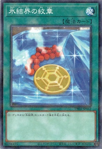 カード名:氷結界の紋章 収録:TERMINAL WORLD 品番:TW01-JP042 レアリティ:ノーマルパラレル 通常魔法 (1):デッキから「氷結界」モンスター1体を手札に加える。