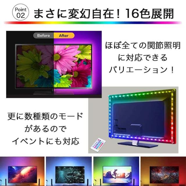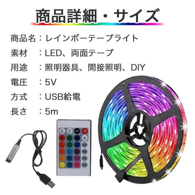 虹色 レインボー 16色 usb電源 リモコン 12v 調光 調色 5m