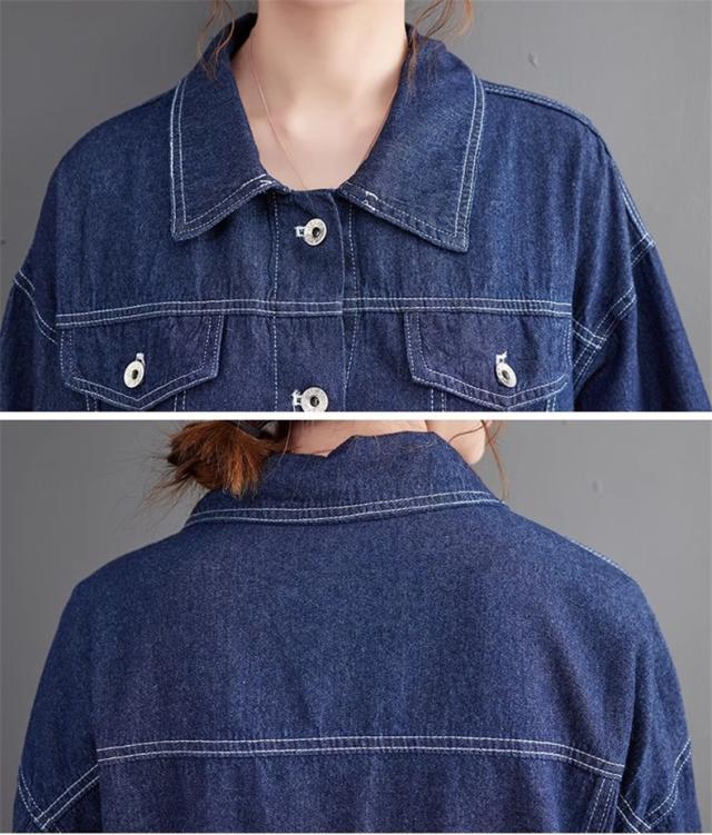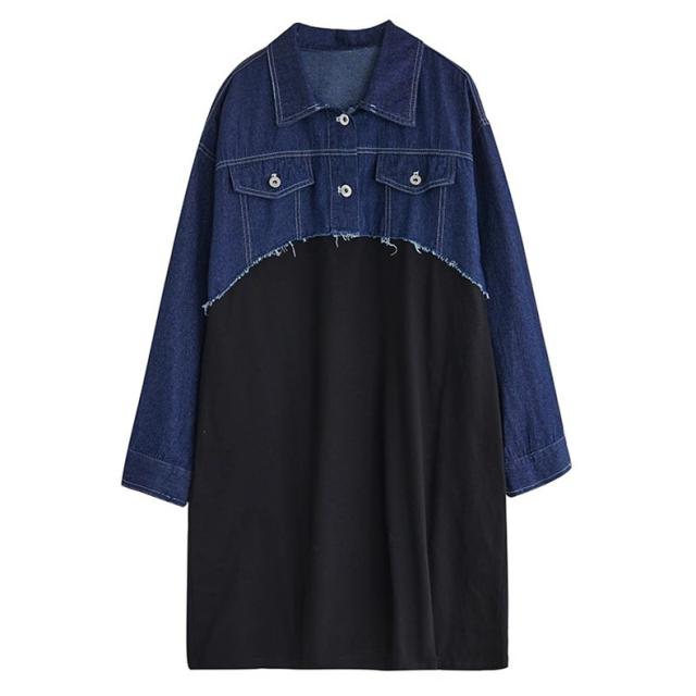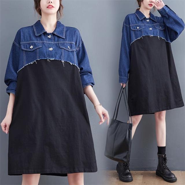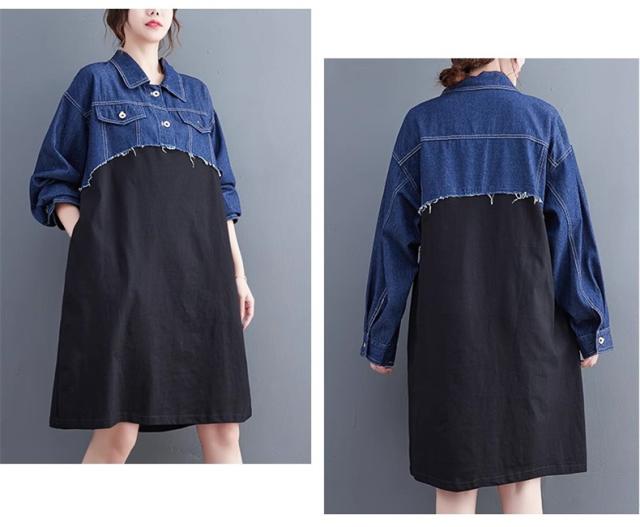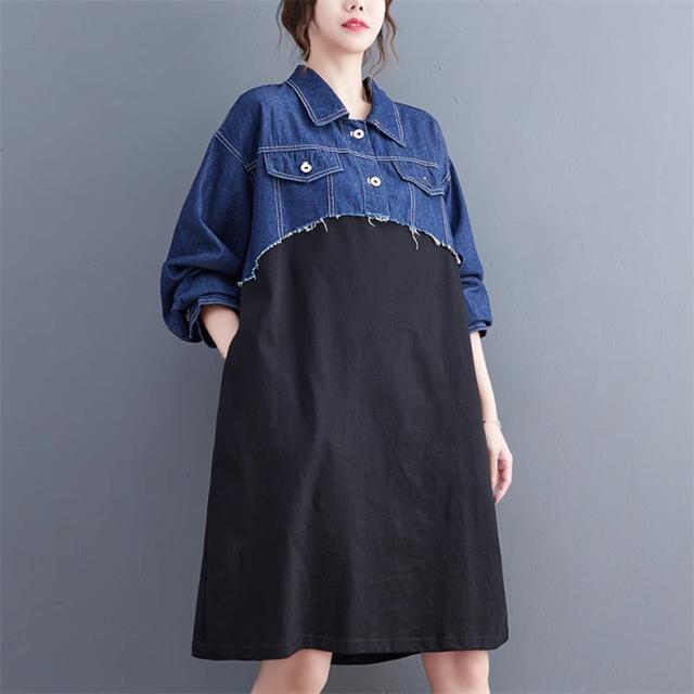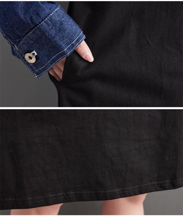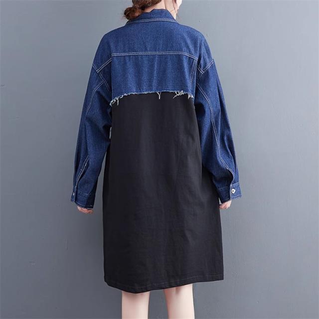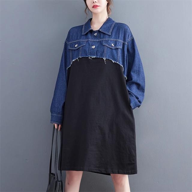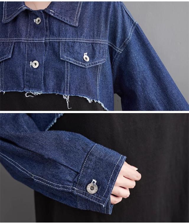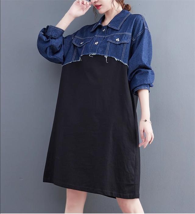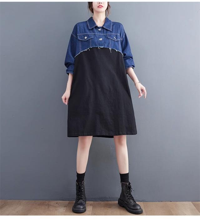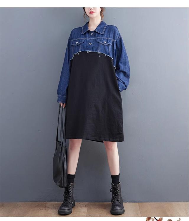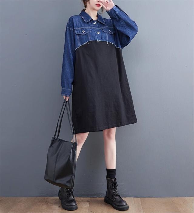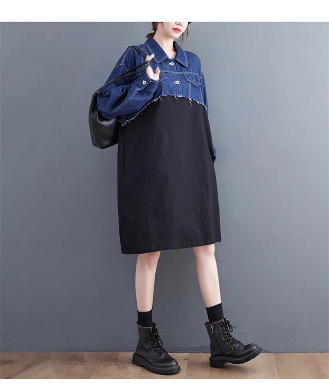 秋ワンピース レディース デニムワンピ 膝下丈 長袖 カットソー 切り替え 異素材 季節の変わり目に重宝する ゆるめのシルエットに ヌケ感が出る お洒落