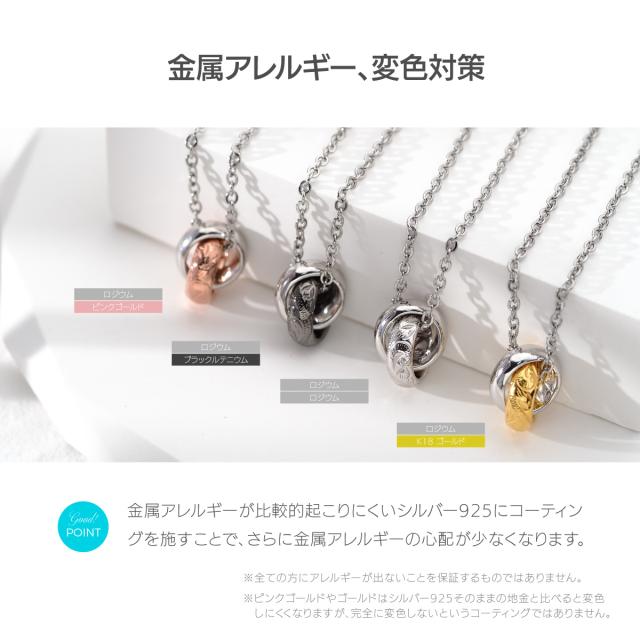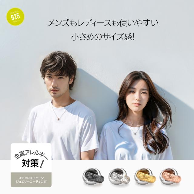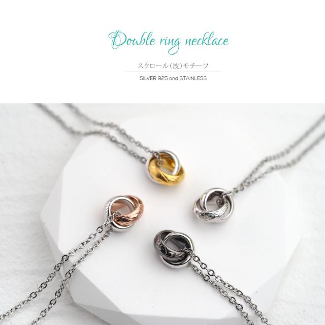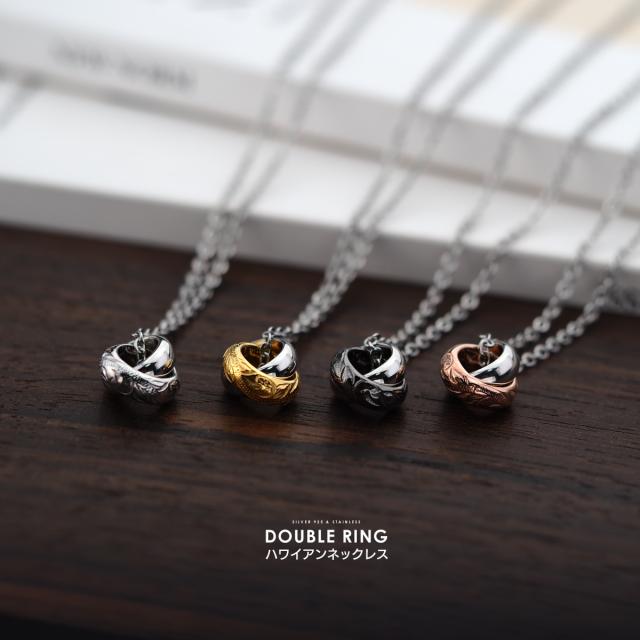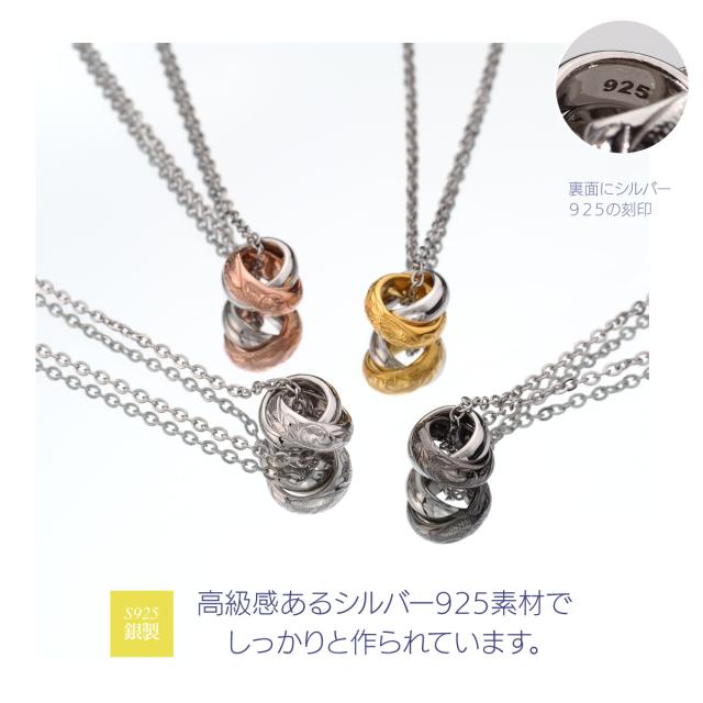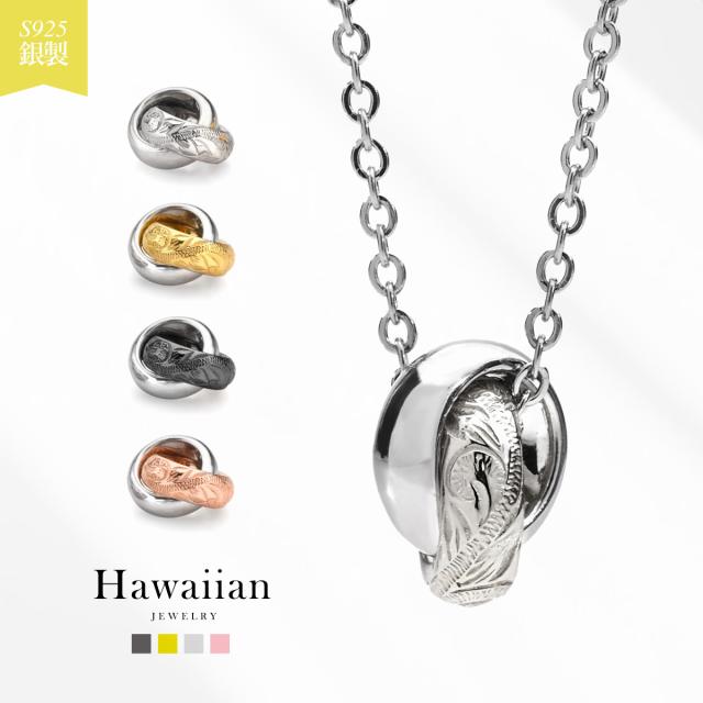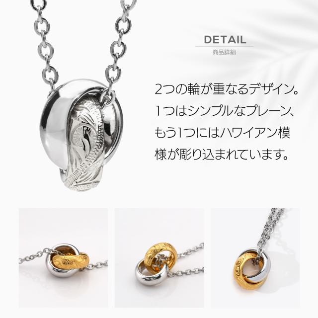 2つのリングが重なったデザインのシルバー925製のネックレスです。2つの輪のうち片方には、ハワイアンジュエリーのスクロール(波模様)が彫り込まれ、もう片方のシンプルなプレーンの輪とのコントラストでシンプルでメリハリのあるデザインです。ハワイアンジュエリーの模様には意味が込められており、スクロール(波模様)には、幸せを運んで来るという意味が込められています。メンズもレディースも着けやすい小さなサイズ感でカジュアルな服装やシンプルスタイルにピッタリのアイテム。シルバー925(銀製)で作られているトップ部分は、ジュエリーコーティングがされているので、変色しにくく、アレルギーの心配も少なく使いやすい仕様です。また肌に触れるチェーン部分は金属アレルギーの心配が少ないステンレス製のチェーンを使用しています。※こちらは1つ売りの販売ページです。ペア商品のご案内は別品番pe2246-pairの販売ページとなります。