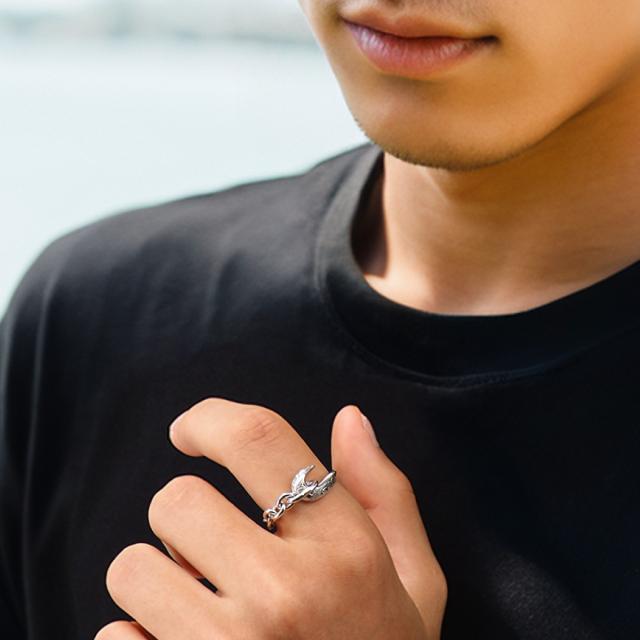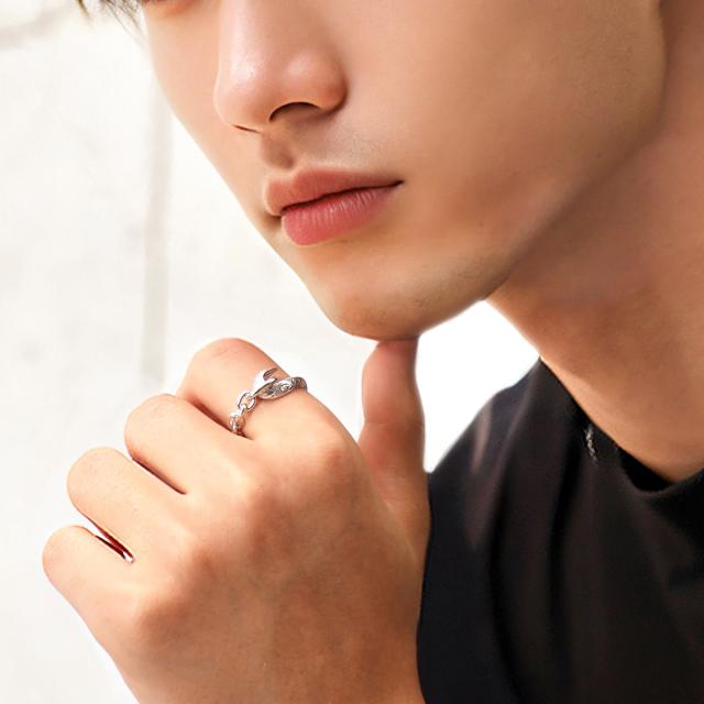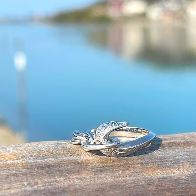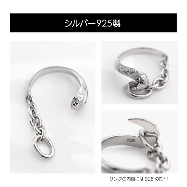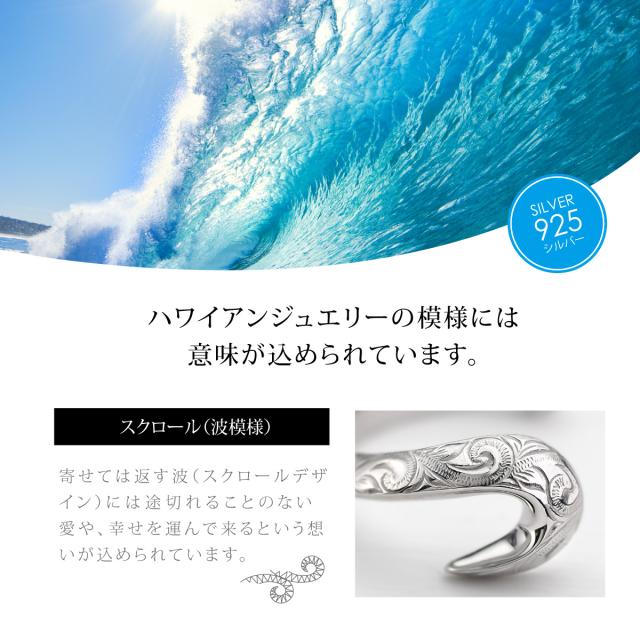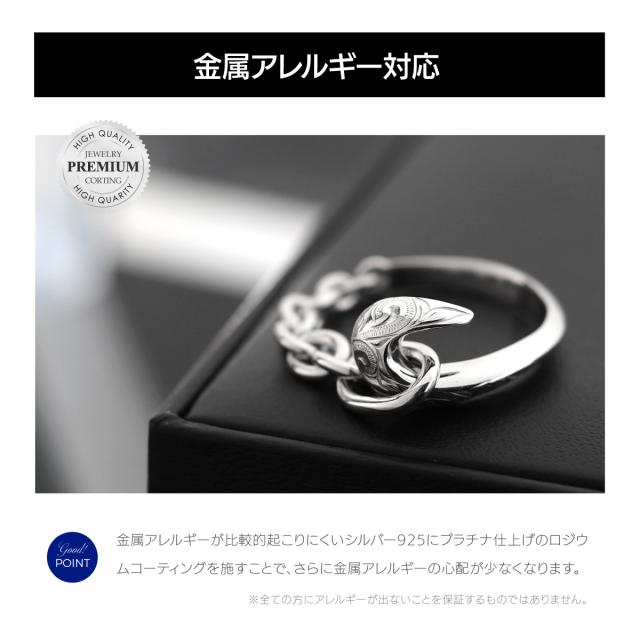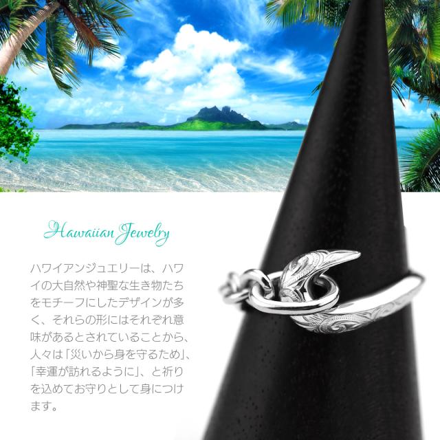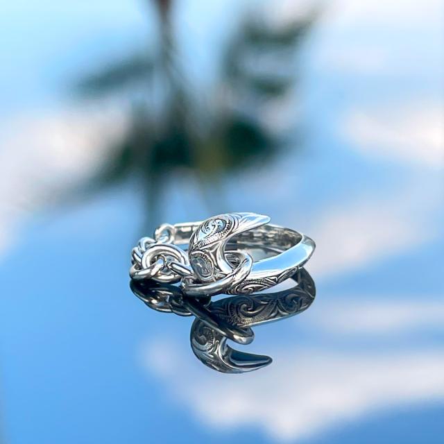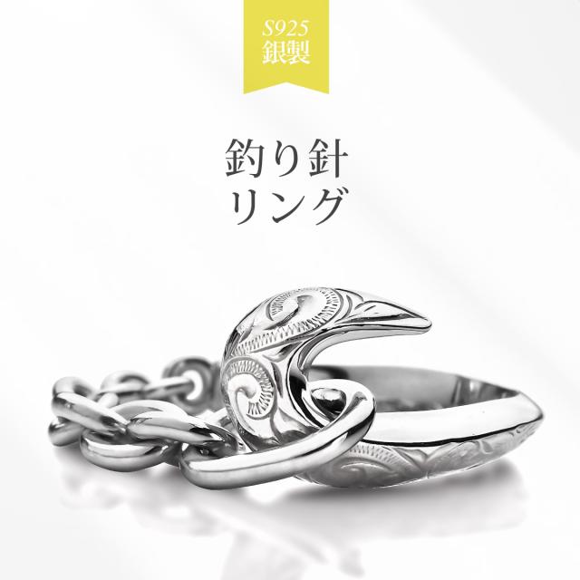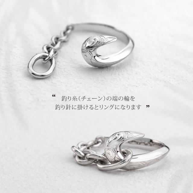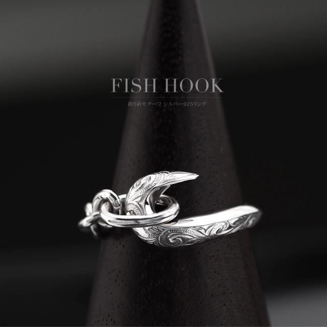 フィッシュフック(釣り針)をモチーフにしたハワイアンジュエリーのシルバー925製のメンズリングです。釣り針をつなぐ糸はシルバーチェーンで表現し、釣り針とチェーンを円状につないで指輪の形状になっています。釣り針部分には、ハワイアン模様のスクロール(波模様)を彫り込まれています。ハワイアンジュエリーの模様には意味が込められており、スクロール(波模様)には、幸せを運んでくるという意味が込められています。地金はしっかりとした作りでシルバー925(銀製)で作られています。さらにロジウムコートでシルバー925をプラチナ仕上げのジュエリーコーティングをしているので、変色しにくく、アレルギーの心配も少なく使いやすい仕様です。