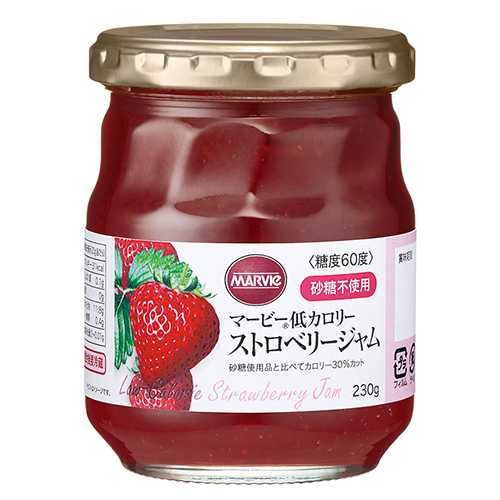 「マービー 低カロリージャム ストロベリージャム 瓶詰 230g」は、砂糖をいっさい使わず、でんぷん生まれの還元麦芽糖の甘さだけで仕上げたストロベリージャムです。砂糖使用品に比べてカロリーを30%カット。甘酸っぱいイチゴのおいしさをそのままに、やさしい甘さのストロベリージャムです。パンなどに塗りやすく、ヨーグルトソースとしても使いやすいみずみずしいなめらかさです。