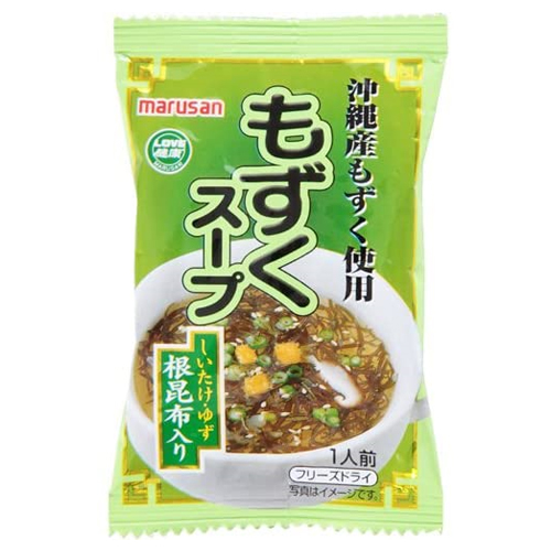 「もずくスープ 1食」は、風味豊かな沖縄産もずくと根昆布を使った、あっさりした醤油味のスープです。お湯を注ぐだけで出来上がります。