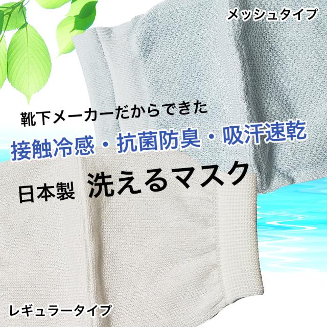 「ハイブリックス ひんやりマスク レギュラー 1枚」は、靴下メーカーが作った、日本製の抗菌防臭・接触冷感・吸汗速乾繊維を使用した洗えるマスクです。使用する繊維は熱伝導率が高く速乾性に優れており、気化熱を奪いやすいため、汗をかいても着用時に清涼感が得られます。水に濡らして絞って使用すると、より冷感を感じやすくなります。また、抗菌防臭性に優れた天然系デオドラント加工「ロンフレッシュ」を付与しているため、繊維上の細菌の増殖を抑制し、防臭効果があります。ゴム紐は自由に長さが調整、交換ができます。