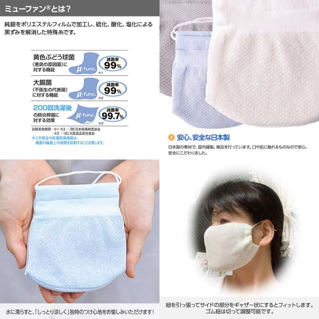 「ハイブリックス ひんやりマスク メッシュ 銀イオン 1枚」は、靴下メーカーが作った、日本製の抗菌防臭・接触冷感・吸汗速乾繊維を使用した、メッシュタイプの洗えるマスクです。さらに、純銀の糸ミューファンを加えることにより、銀イオンが高い抗菌・防臭効果を持続的に発揮します。使用する繊維は熱伝導率が高く速乾性に優れており、気化熱を奪いやすいため、汗をかいても着用時に清涼感が得られます。水に濡らして絞って使用すると、ひんやりと冷感を感じやすくなります。また、抗菌防臭性に優れた天然系デオドラント加工「ロンフレッシュ」を付与しているため、繊維上の細菌の増殖を抑制し、防臭効果があります。さらに除菌効果、殺菌効果がある銀イオンの糸を使用しています。ゴム紐は自由に長さが調整、交換ができます。