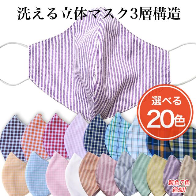 「洗える立体マスク3層構造 1枚」は、洗って繰り返し使える、3層構造の立体マスクです。表面に綿+ポリエステル、中面に不織布、内面に綿+ポリエステルを使用しています。男女兼用でご使用いただける、大きめサイズ。