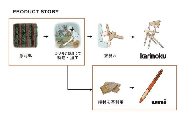 家具の製造工程で生まれる木の端材を利用…ペンのグリップに使われています。