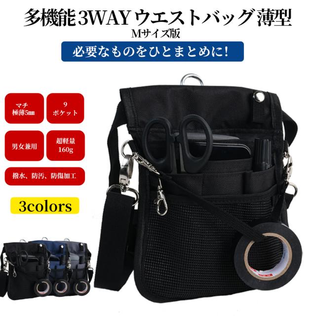 多機能 3way ウエストポーチ ナースポーチ ウエストバッグ 薄型 改良版 カラビナ ショルダーベルト付き 9ポケット マチ 極薄5mm 文房具 小物入れ 大容量 仕事用 作業用 事務 看護 介護 DIY 簡易工具バッグ 撥水 防傷加工 Mサイズ