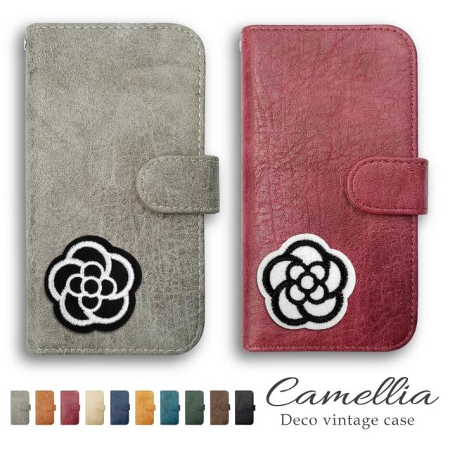 Xperia 5 V SO-53D SOG12 エクスペリア5マーク5 スマホケース おしゃれ かわいい 手帳型ケース カバー ビンテージ調 カメリア 花柄 ワッペン キラキラ グリッター