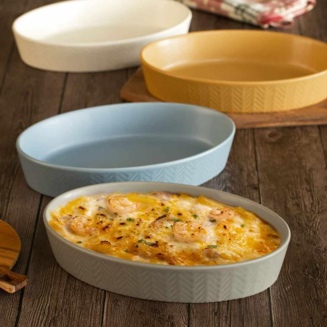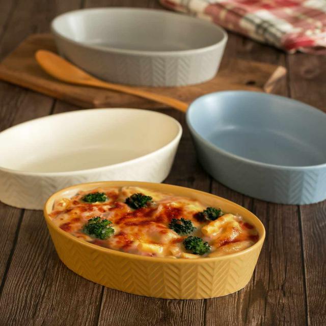 さりげないヘリンボーン柄が美しいグラタン皿です。お料理が引き立つシンプルなデザインと、ベーシックな色味でどんな食卓にも馴染みやすいです。気取り過ぎない素朴なテイストが、ほっこりとした雰囲気の空間を演出します。