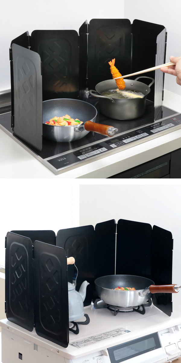 油はねが気になる調理の時、フライパンや鍋のそばに立てるだけで設置は完了。コンロやIH、鍋などのサイズを気にせずにお使いいただけます。