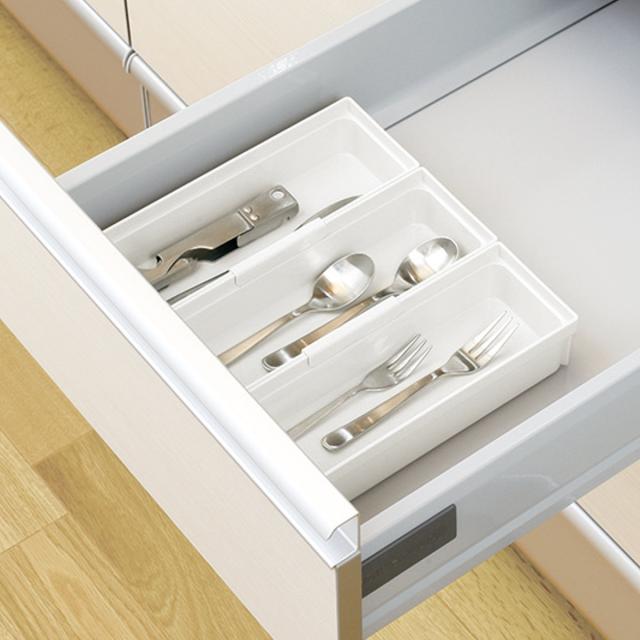 引き出しの中でサイズ別に分けて、様々なカトラリーの定位置を作り美しく収納できます。どこに何があるか引き出しを開けたときに分かりやすく、出したカトラリーをどこに戻すかも一目瞭然です。
