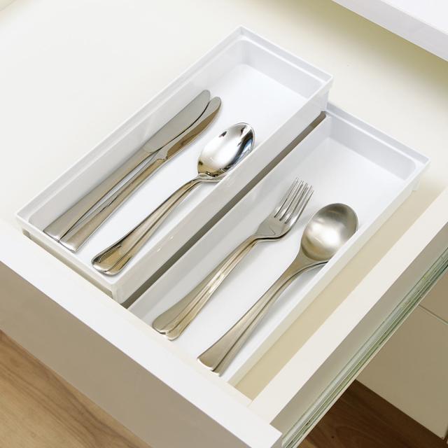 引き出しの中でサイズ別に分けて、様々なカトラリーの定位置を作り美しく収納できます。どこに何があるか引き出しを開けたときに分かりやすく、出したカトラリーをどこに戻すかも一目瞭然です。