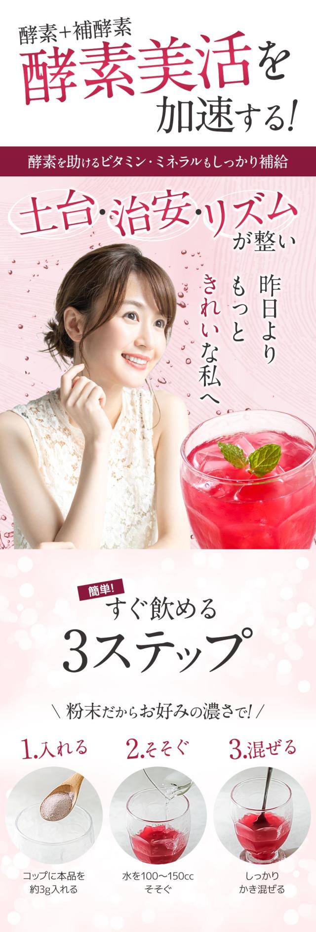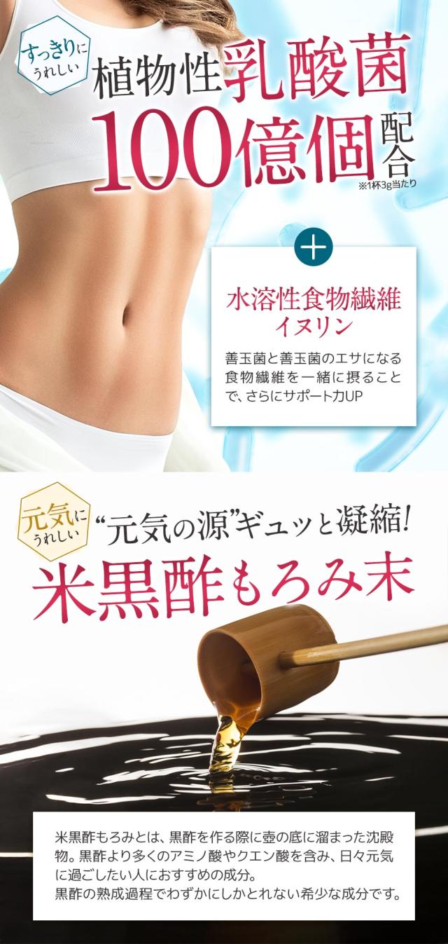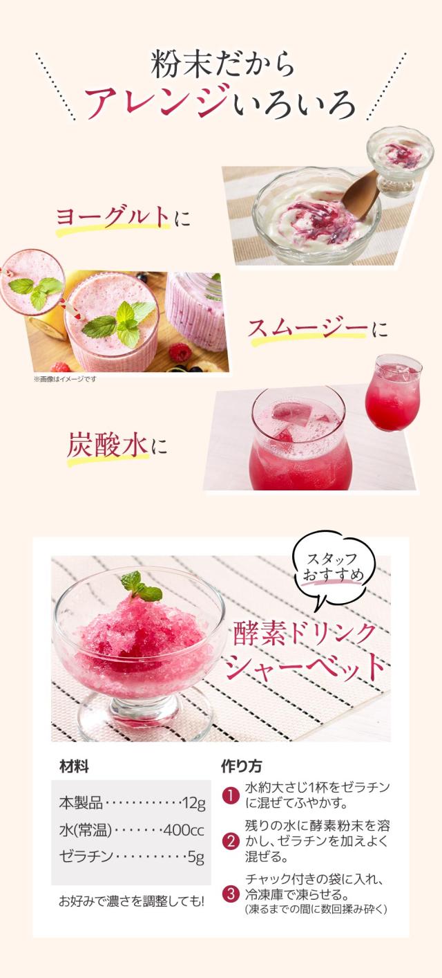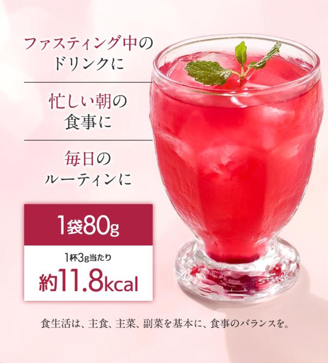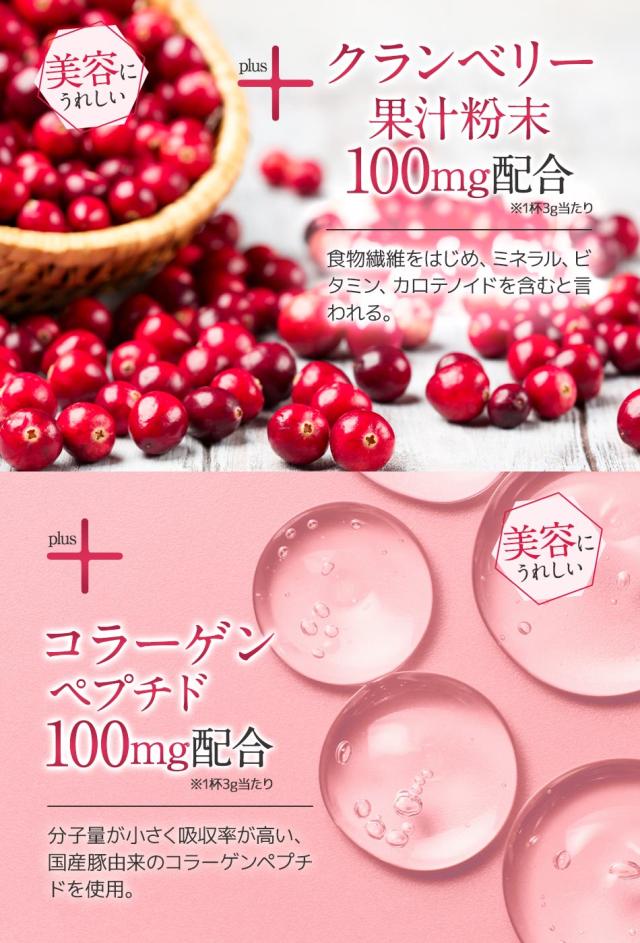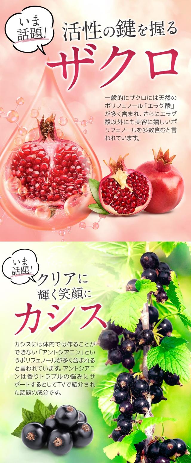 還元麦芽糖水飴(国内製造)、イヌリン(食物繊維)、植物発酵物(マルトデキストリン、植物発酵物)、コラーゲンペプチド、馬プラセンタエキス末、クランベリー果汁粉末(デキストリン、クランベリー濃縮果汁)、ブラックカラントエキス末、ザクロ果皮エキス末、米黒酢もろみ末、植物性乳酸菌末(植物性乳酸菌(殺菌)、デキストリン)/クエン酸、香料、甘味料(ステビア、甘草)、(一部に小麦・りんご・バナナ・ゼラチンを含む)