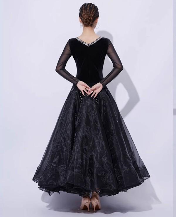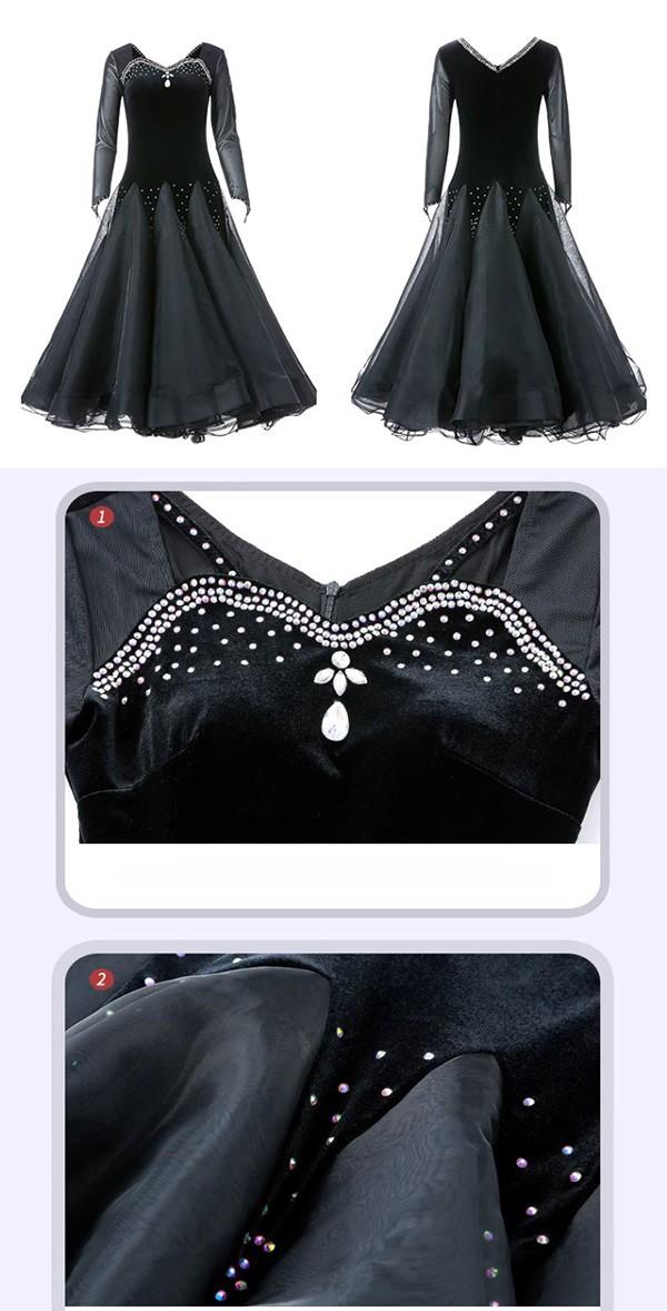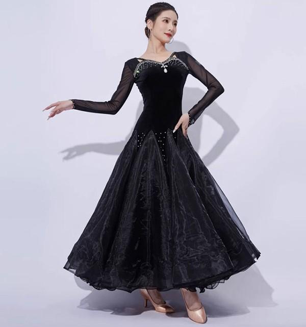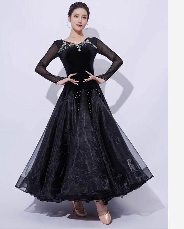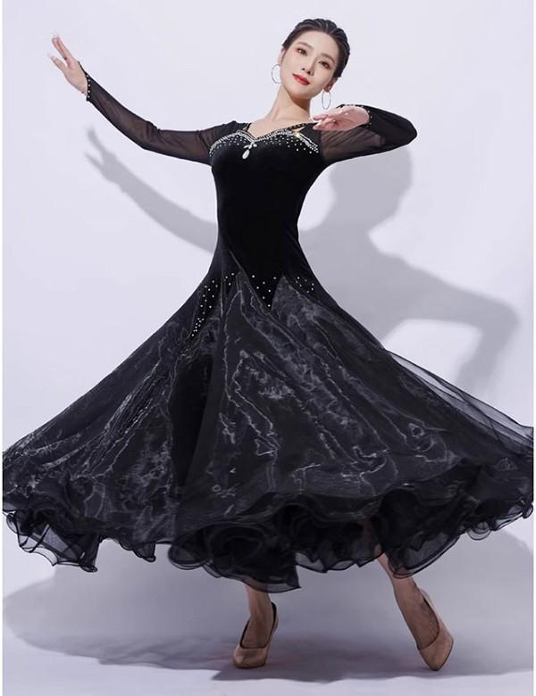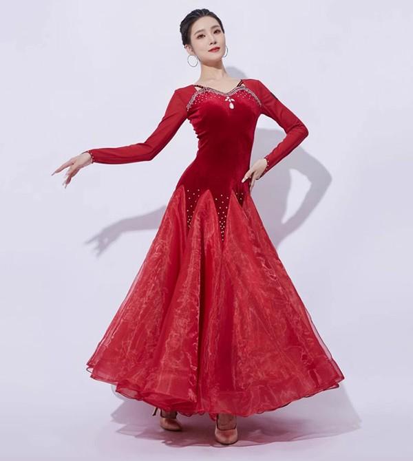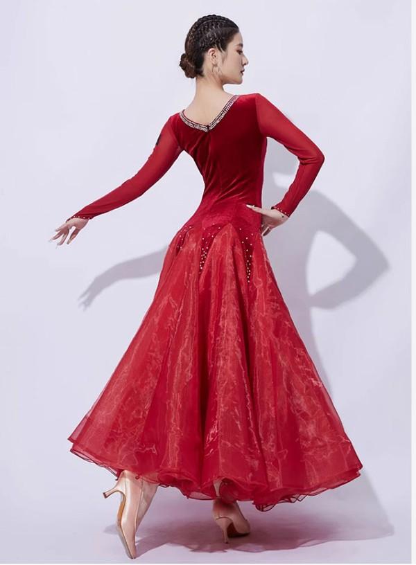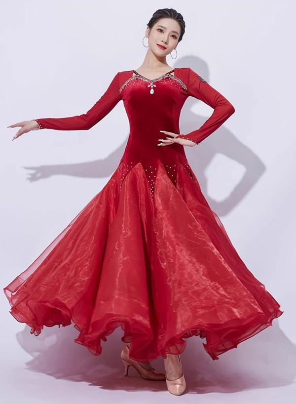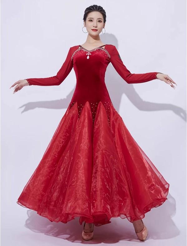 社交ダンスドレス 社交ダンス モダンドレス 大きいサイズ 長袖 広がる裾 スタンダードドレス ワルツダンス ワンピースドレス ダンス衣装 ダンスウェア ステージ衣装 競技会 カラオケ デモ パーティー 発表会 競技着 練習着 舞台 演奏会 演出 黒 赤as048s1s1l9