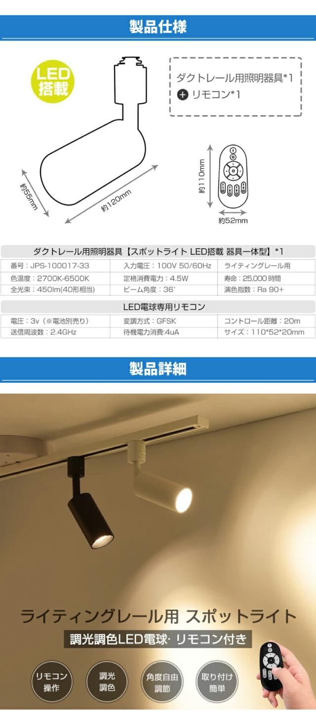 | 商品説明 | スポットライト ダクトレール用 4.5W(40W形相当) リモコン付き ライティングレール用 LED内蔵式 電球不要 北欧 角度可動 取付簡単 電気 コンセント 壁 天井 おしゃれ 電球色 昼白色 照明器具 屋内照明 LED一体型照明 ブラック |