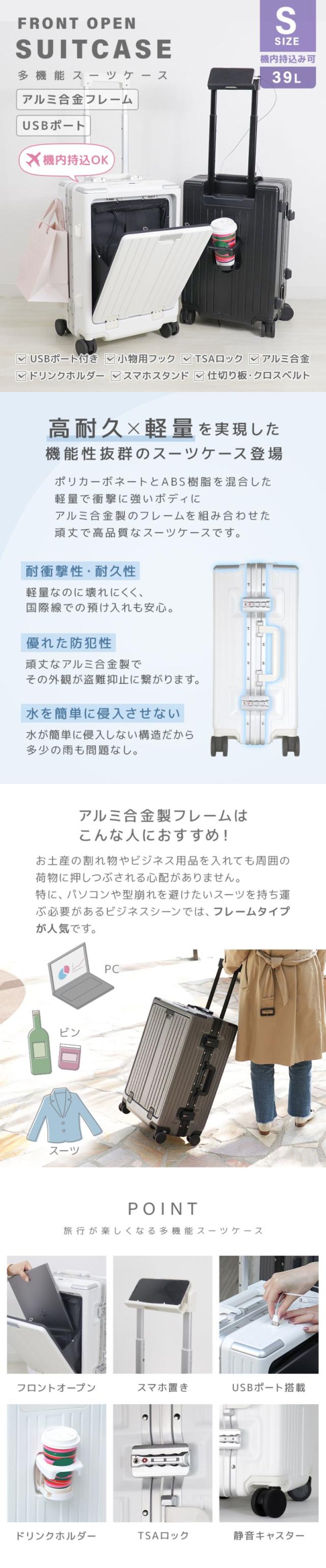 【上位モデル!アルミフレーム】 スーツケース 多機能 機内持ち込み フロントオープン Sサイズ アルミフレーム USB充電 カップホルダー TSAロック キャリーケース アルミ合金製フレーム 軽量 キャリーカート 39L 中型 大型 キャリーバッグ 軽量 静音 おしゃれ 旅行 出張