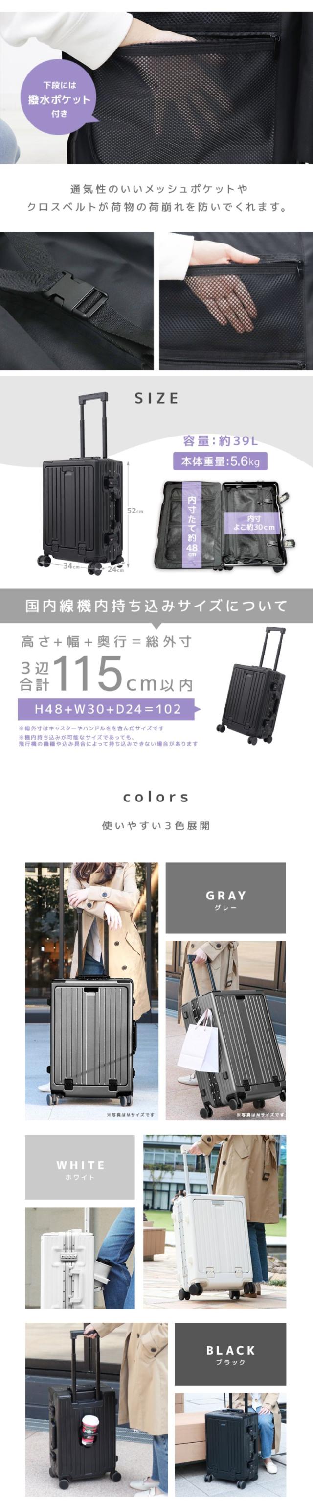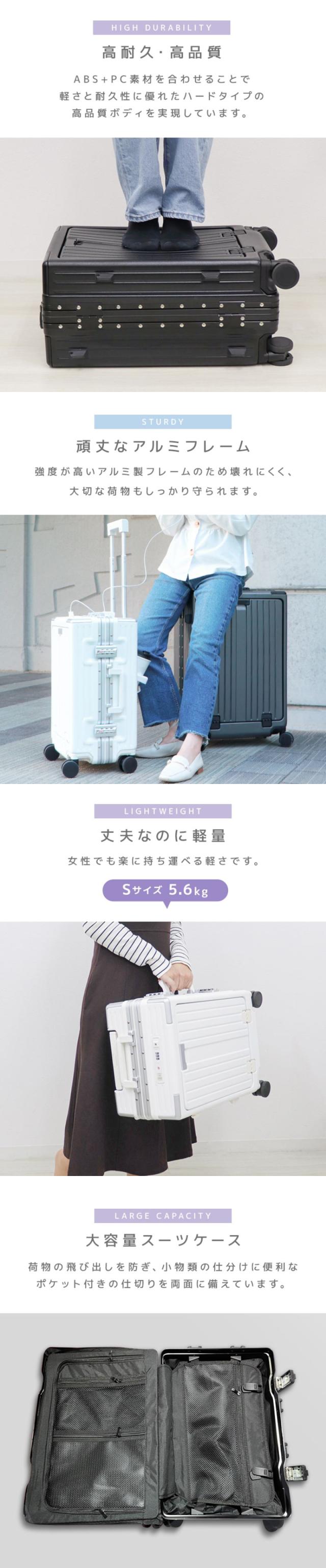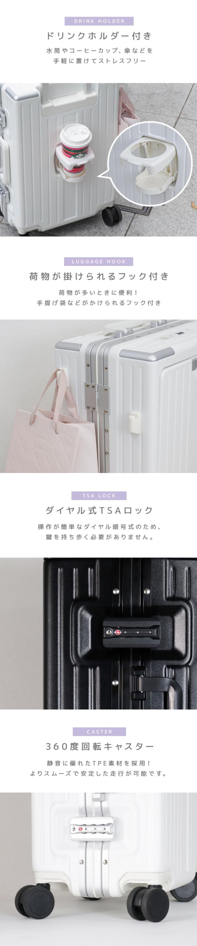 | 特徴 | フロントオープン ダイヤル式TSAロック USBポート搭載 スマホスタンド ドリンクホルダー 物掛けフック 静音キャスター |
