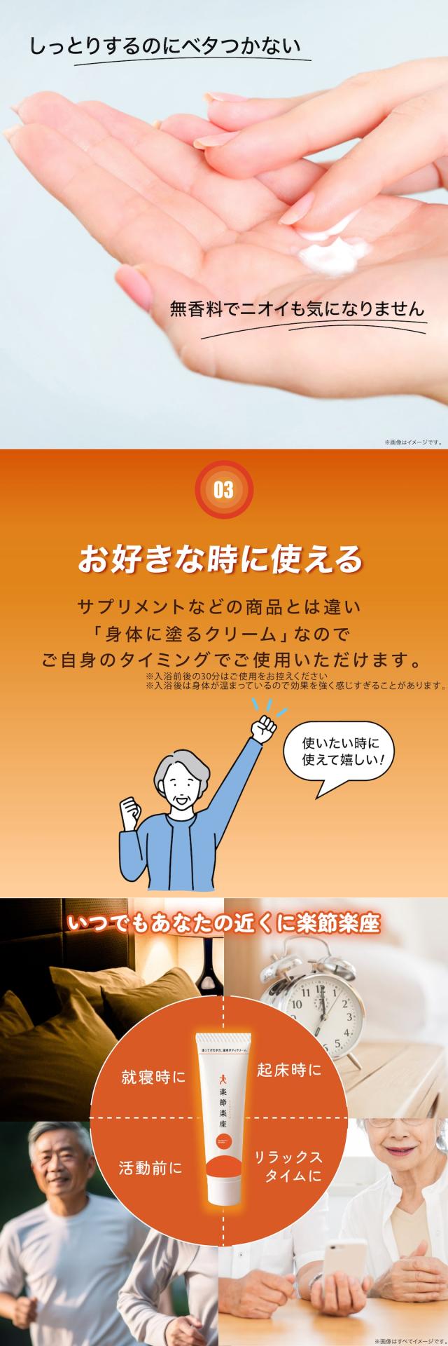 楽節楽座温感クリームは、かつてのように思いきり動かせるよう、やさしく塗りこんでもみほぐし、ツラい部分を癒してあげる「塗るグルコサミン」クリームです。