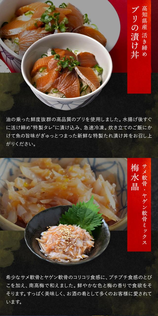 活き締めブリ漬け丼〕ブリ(高知県)、醤油加工品(みりん、醤油(大豆・小麦を含む)、鰹節、米)
