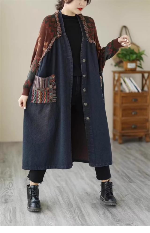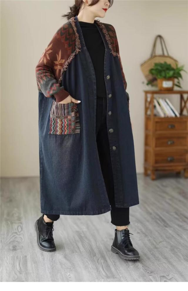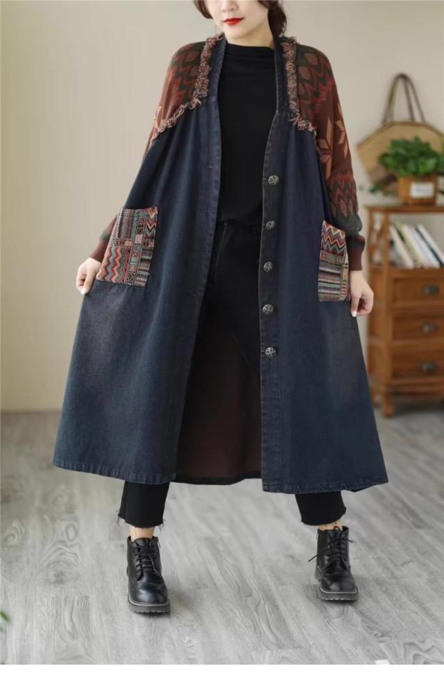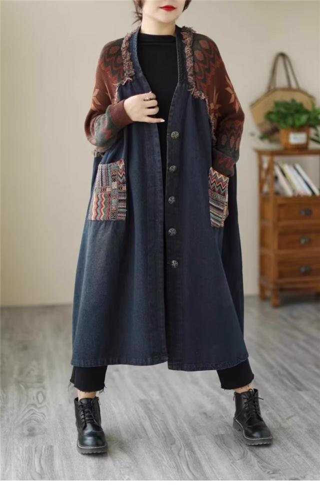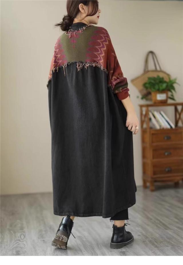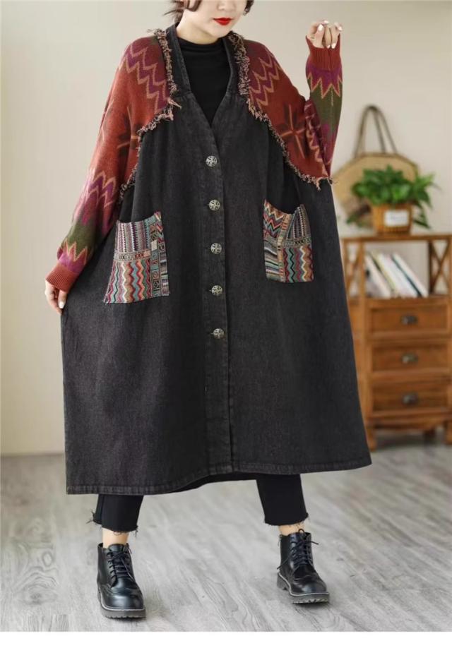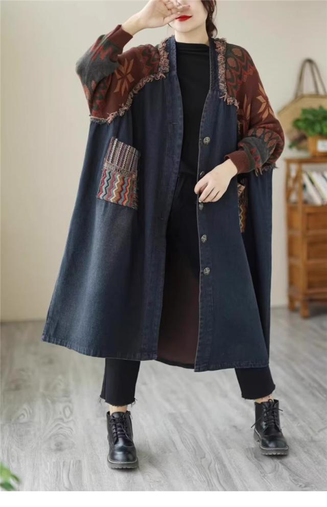 デニムコート 異素材 切り替え レディース 長袖 アウター ロング丈 デニムジャケット 羽織り ゆったりとしたシルエット 大人カジュアルな風合いが魅力