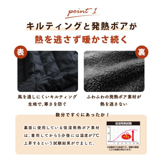 【キルティングと発熱ボア】風を通しにくいキルティング生地と、熱を逃さないふわふわのボア素材で暖かさが続きます
