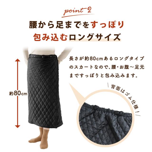 【ロングサイズ】長さが約80cmあるロングタイプのスカートなので、腰・お腹〜足元まですっぽりと包み込みます。