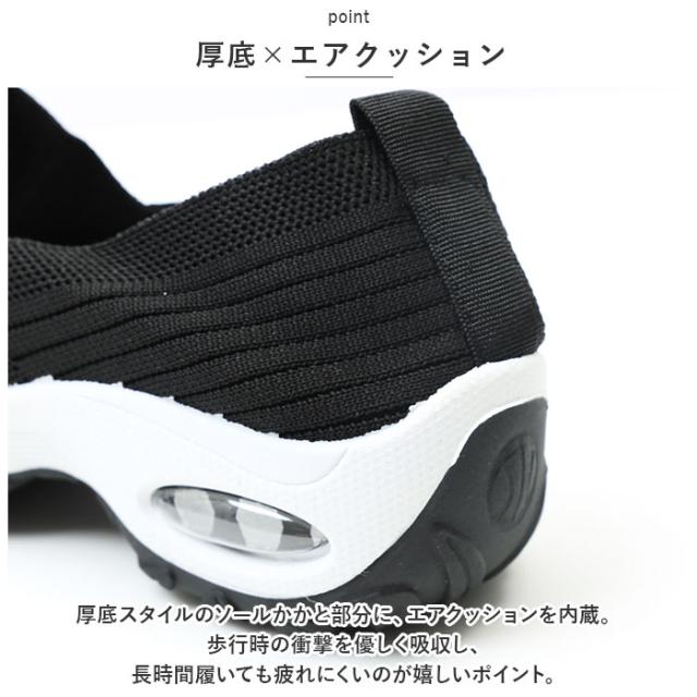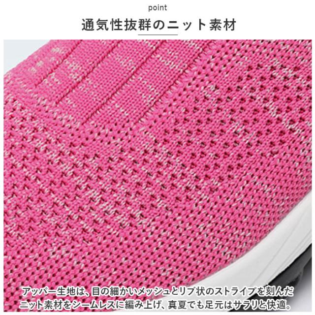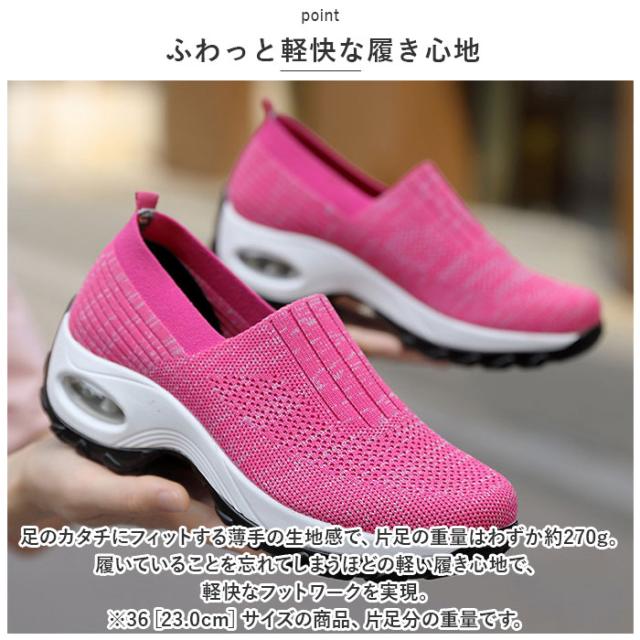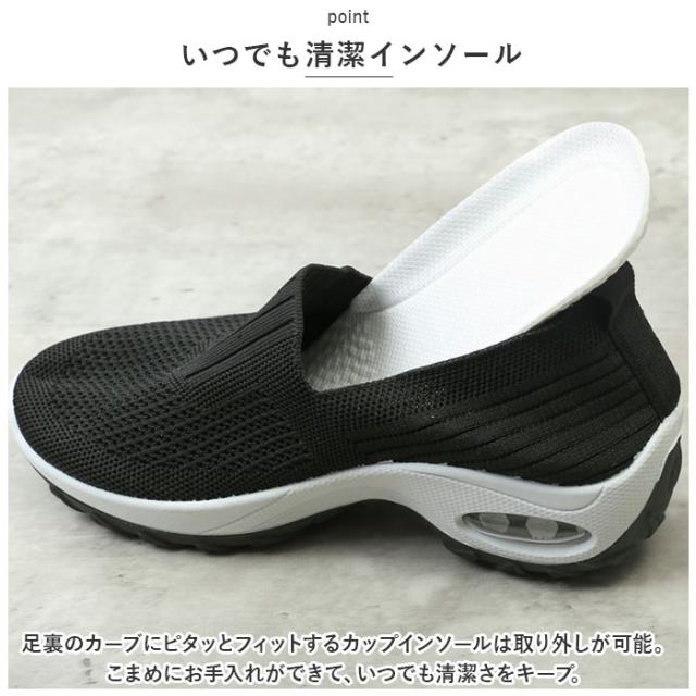 | 商品説明 | ・つま先がスッと入って気軽に履ける♪素足のままでも心地よい「レディース ニットスニーカー」が新登場。 【通気性抜群のニット素材】 ・アッパー生地は、目の細かいメッシュとリブ状のストライプを刻んだニット素材をシームレスに編み上げ、真夏でも足元はサラリと快適。 【厚底×エアクッション】 ・厚底スタイルのソールかかと部分に、エアクッションを内蔵。歩行時の衝撃を優しく吸収し、長時間履いても疲れにくいのが嬉しいポイント。 【ふわっと軽快な履き心地】 ・足のカタチにフィットする薄手の生地感で、片足の重量はわずか約270g。履いていることを忘れてしまうほどの軽い履き心地で、軽快なフットワークを実現。(※36[23.0cm]サイズの商品、片足分の重量です。) 【スポッと脱ぎ履きスムーズ】 ・足の甲の当たるシューズ履き口部分は、リブ生地が程よく左右に伸縮し、スリッポンみたいに脱ぎ履きスムーズ♪かかとを踏んだままスポッとつま先を入れて、サンダル感覚で気軽に履いてもOK! 【滑りにくいアウトソール】 ・流線形の凹凸を刻んだアウトソールが、雨に濡れた路面やフラットなフロアーもしっかりとグリップ。 【いつでも清潔インソール】 ・足裏のカーブにピタッとフィットするカップインソールは取り外しが可能。こまめにお手入れができて、いつでも清潔さをキープ。 【嬉しい脚長効果も♪】 ・ちょっぴり厚底約4cmのソールで脚長効果にも期待♪スポーツやお出掛けの時も、素敵にスタイルUP! 【コーデ自在のシンプルカラー】 ・スポーツウェアだけでなく、大人カジュアルな服装にも自然に馴染むベーシックカラーのシンプルなバリエーション。 【スポーツや普段使いに最適】 ・ジムでのトレーニングや、ランニングなどのフィットネスにはもちろん、ちょっとそこまでのお出掛けやオフィス用のコンフォートシューズにもオススメ! |