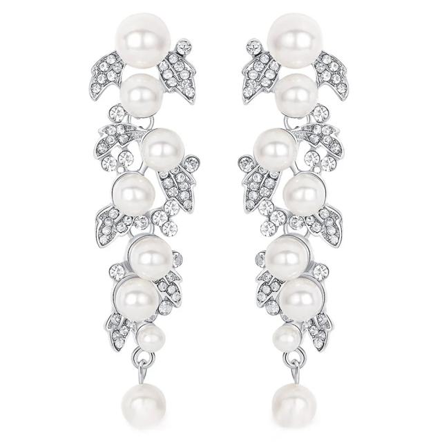 フルーツパール クリスタルウエディングジュエリーピアス 1ペア シルバー キャッチピアス ポスト 新婦 結婚式 お披露目 花嫁 揺れる ジルコニア ラインストーン レディース 20G 20ゲージ パーティー 女 ドレス ブライダル プリンセス 真珠 葉 リーフ イミテーションパール