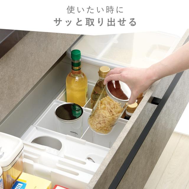よく使う調味料を引き出しの取り出しやすい位置に立てて収納できます。種類別に分けることで必要な時にすぐに見つかり調理や配膳がスムーズに進みます。