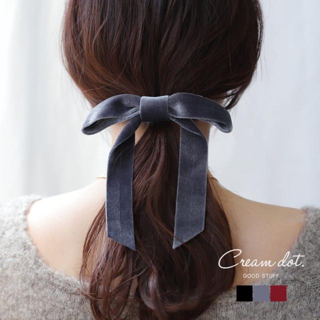 光沢感ある大きめベロアリボンのポニーフック。程よいボリューム感で普段のスタイルにパッと華やかな印象をプラス。ロングヘアのローポニーやお団子スタイルにさりげなく差し色を添えて。