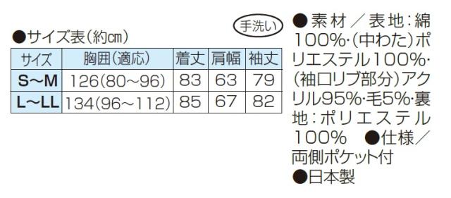 ● 素材/表地:綿100%・(中わた)ポリエステル100%・(袖口リブ部分)アクリル95%・毛5%・裏地:ポリエステル100%