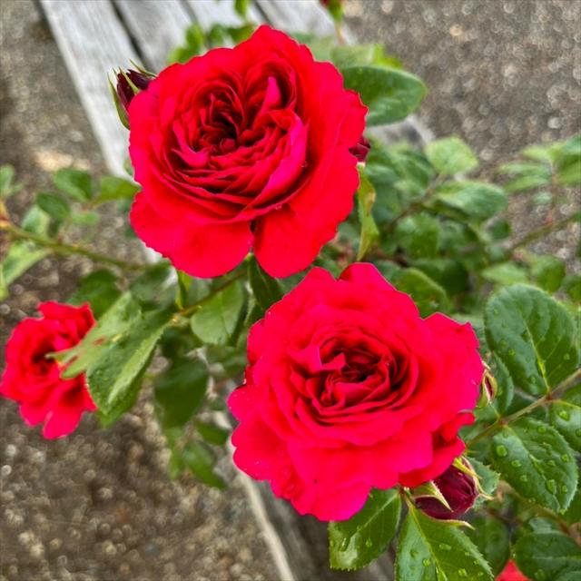 深紅のクォーターロゼット咲きで、咲き進むに連れてピンク味が強く現れ、明るい花色となる。