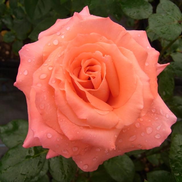 環境や季節によって、朱色を帯びたオレンジ〜サーモンオレンジの複雑な色合いを見せる半剣弁高芯咲き。