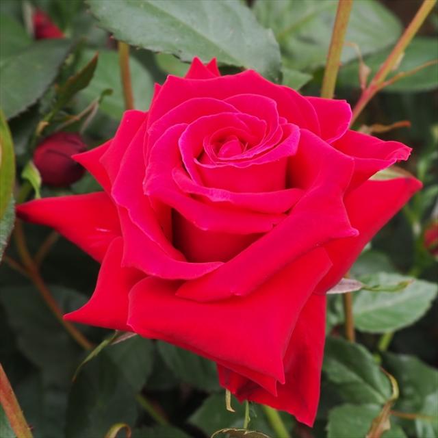 ベルベットのような光沢のある赤色で整った剣弁高芯咲き。